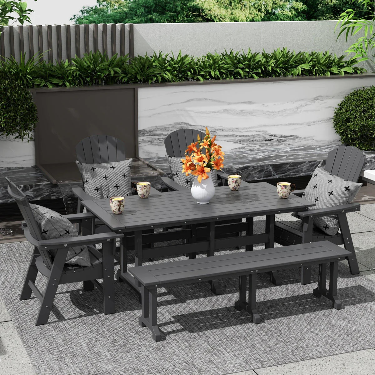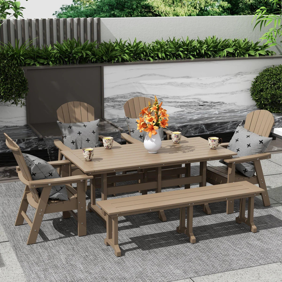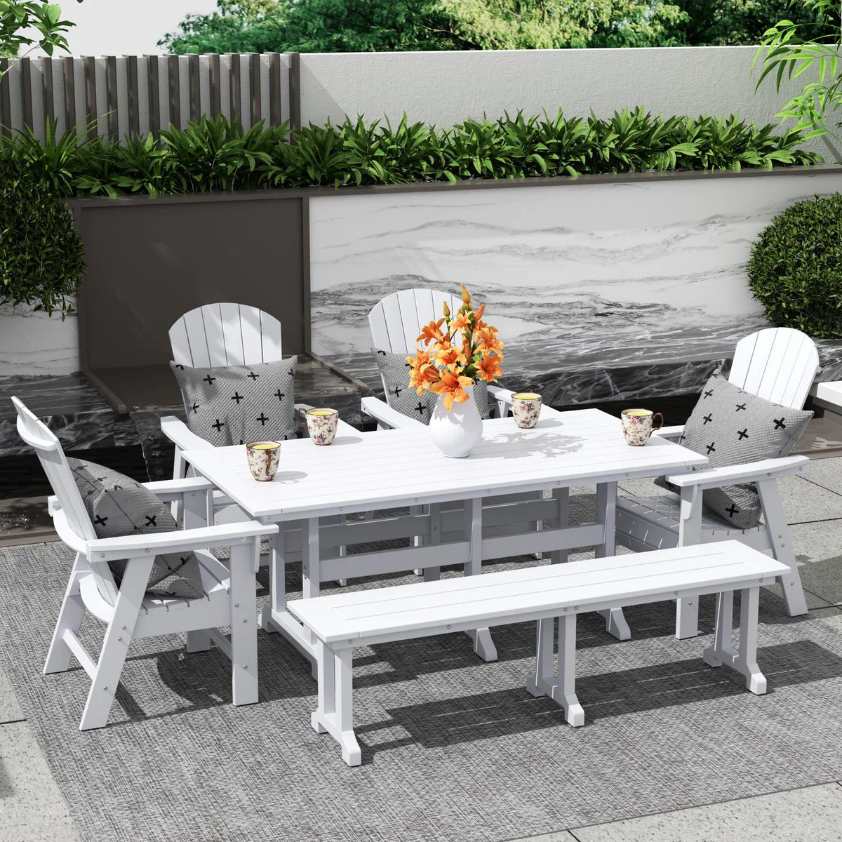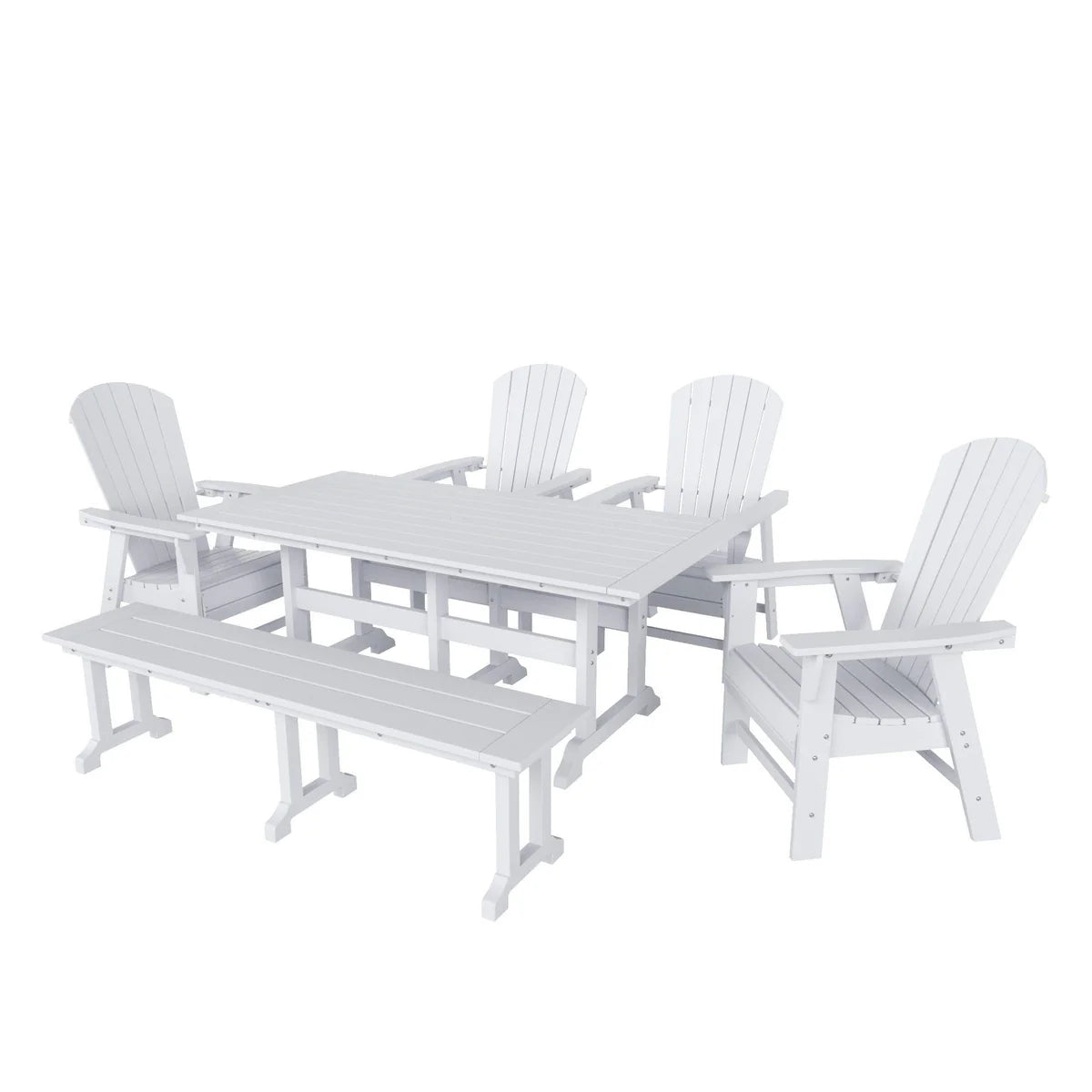 - Set Includes: One (1) Rectangle Dining Table, One (1) Bench, Four (4) Adirondack Dining Chairs