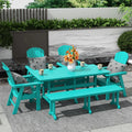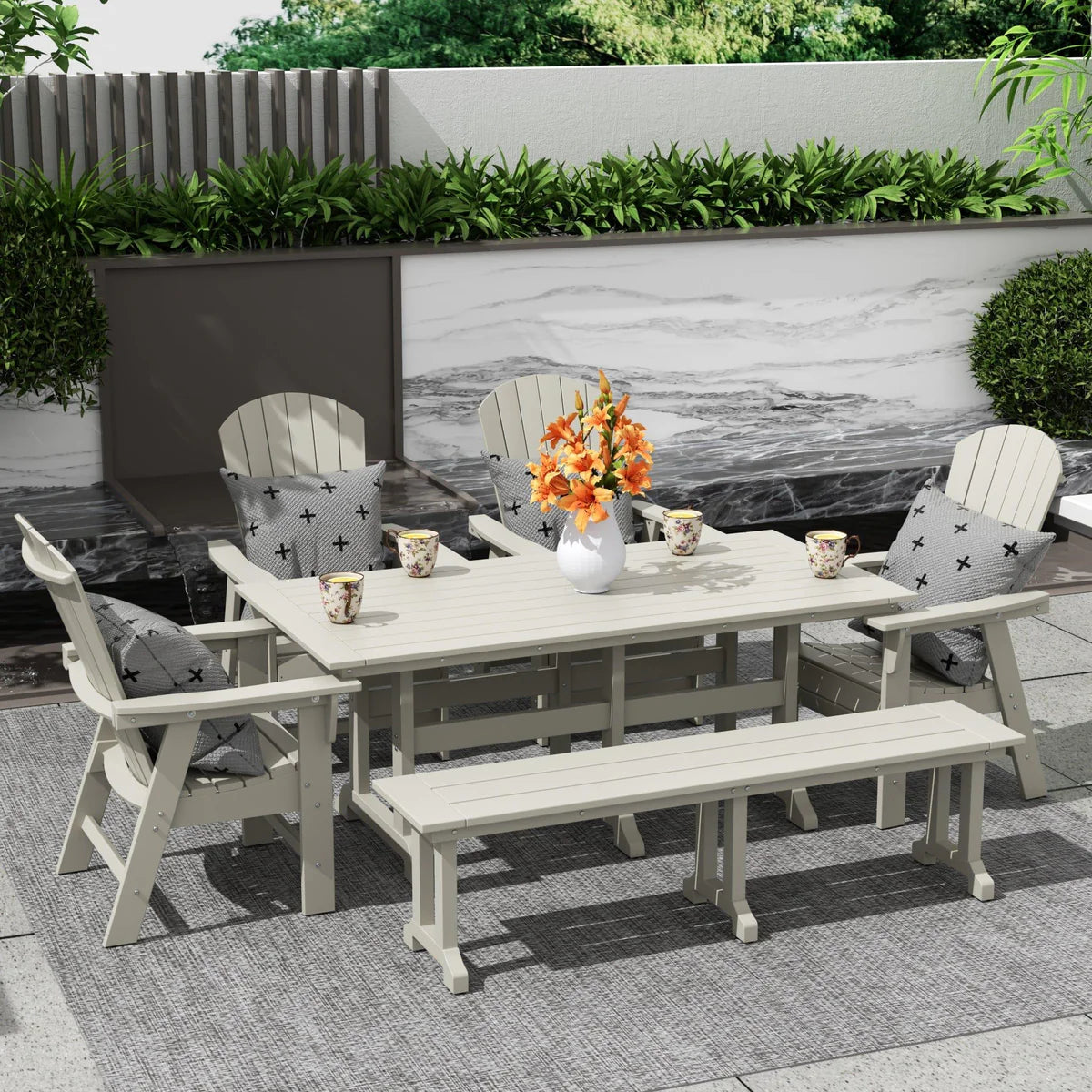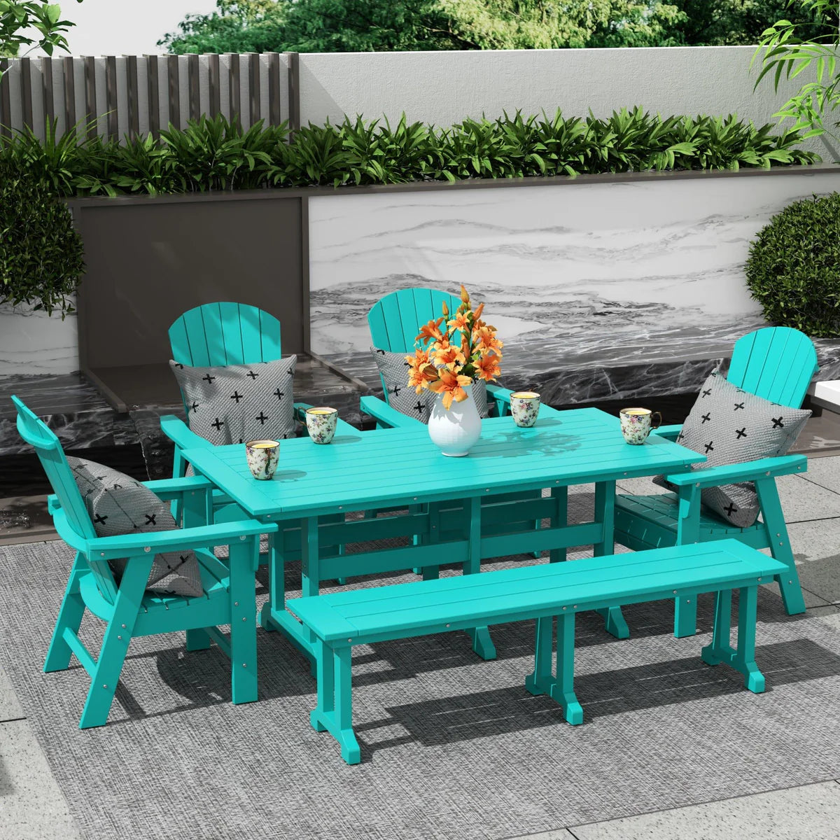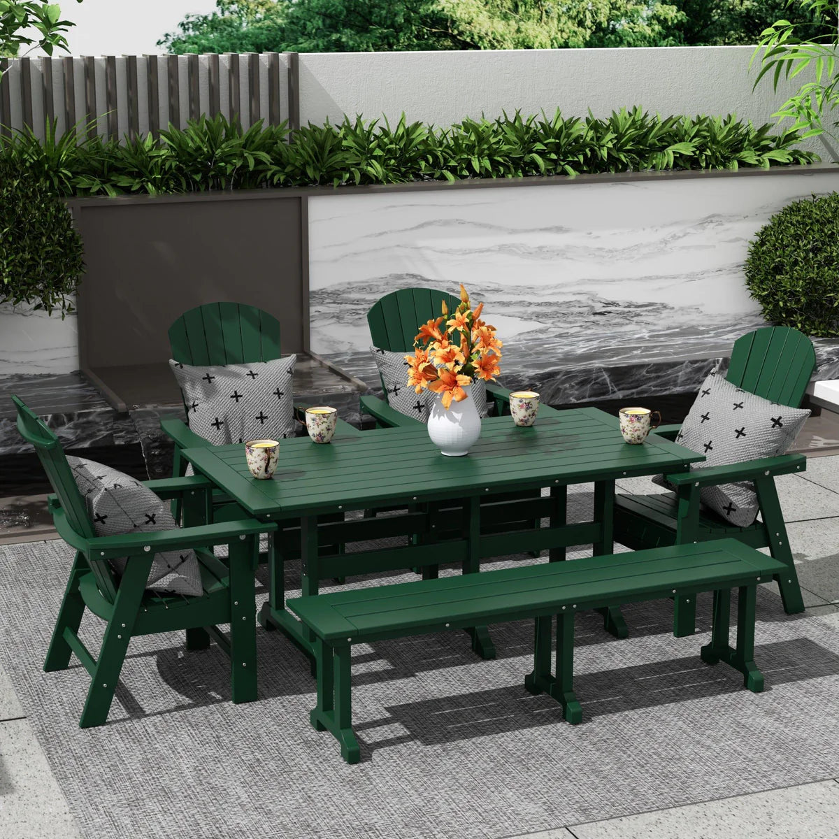 - Set Includes: One (1) Rectangle Dining Table, One (1) Bench, Four (4) Adirondack Dining Chairs