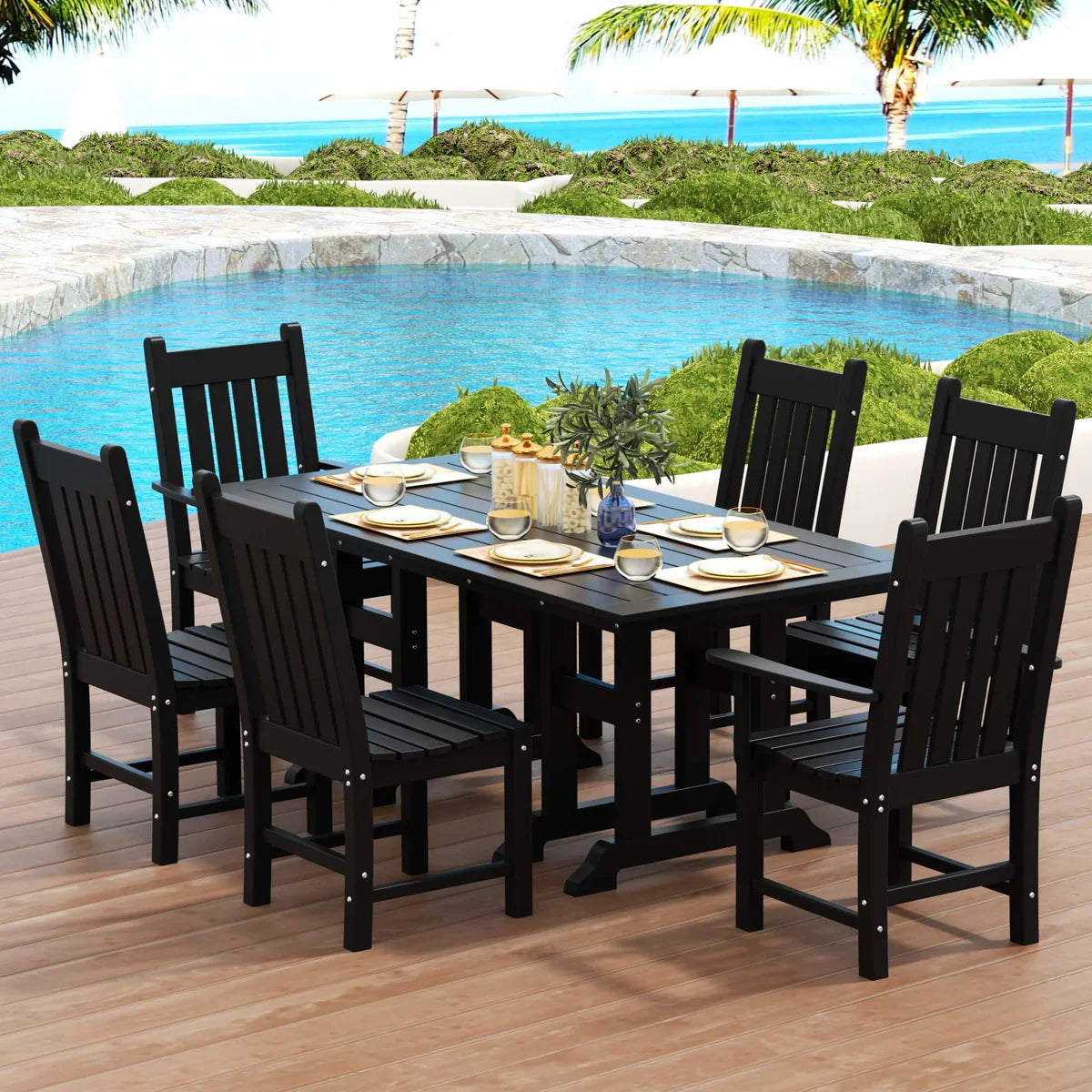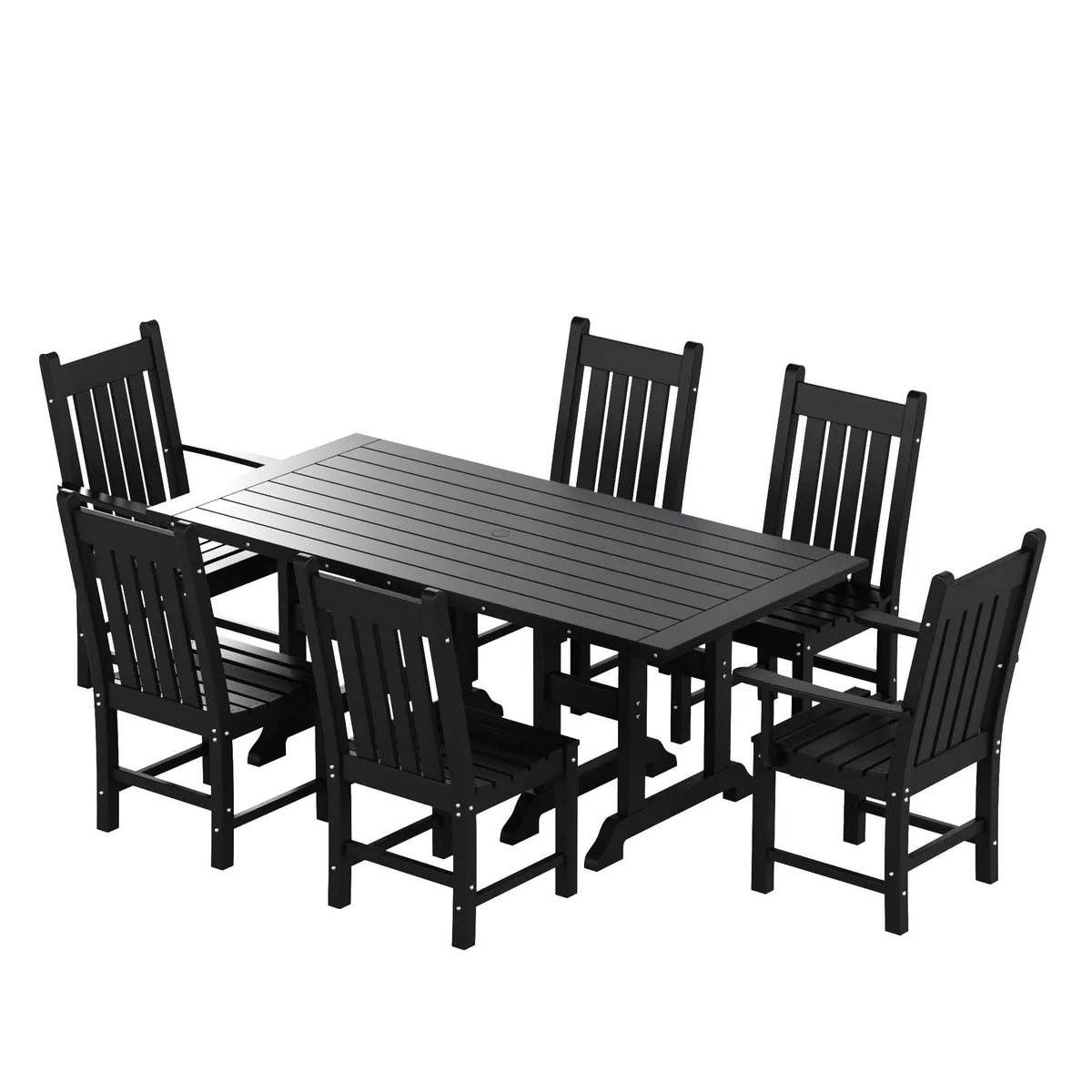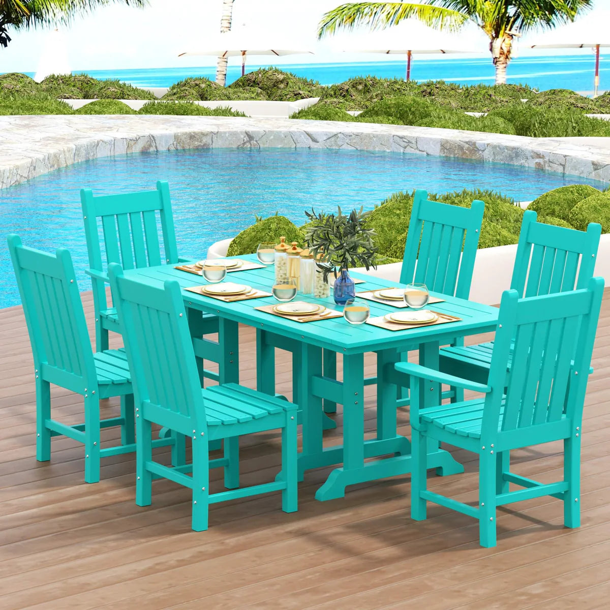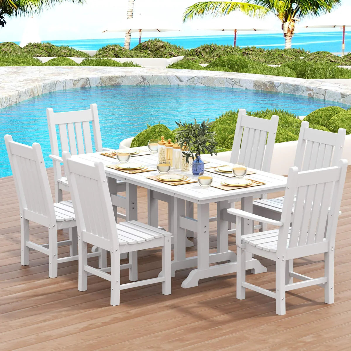 Gather family and friends around the table to enjoy outdoors with this 7-Piece dining set. This classic set can be seats up to six guests, place this spacious set on your patio or deck, you and your family or friends can sit around it on warm summer evenings and create an intimate outdoor dining atmosphere, enjoy making many memories together for years to come. Constructed of durable HDPE poly plastic and rust resistant hardware. Made with quality materials that will last the test of time. The eco friendly plastic outdoor table and chair sets will resist moisture, decay, and rainwater. Resistant to a variety of weather conditions and UV treated to help keep its rich color.