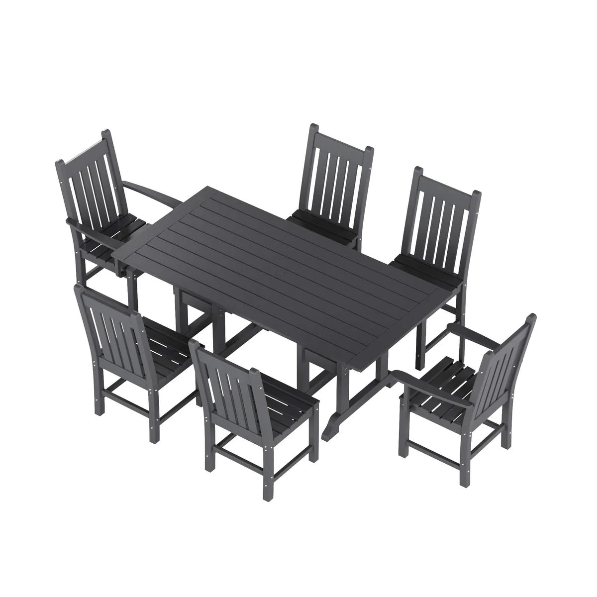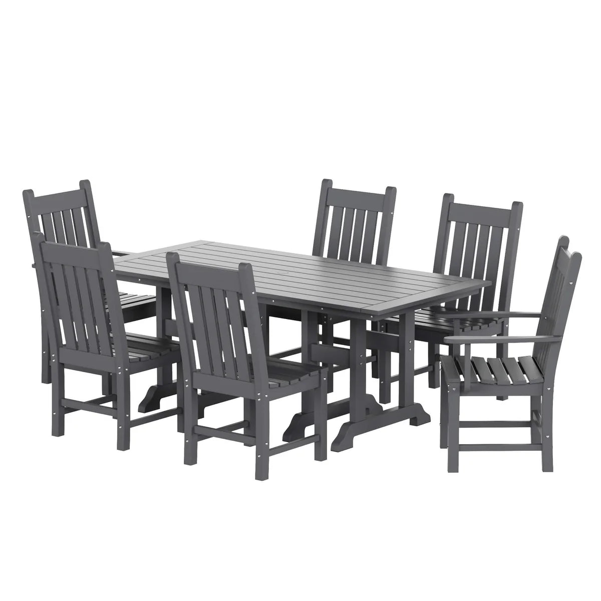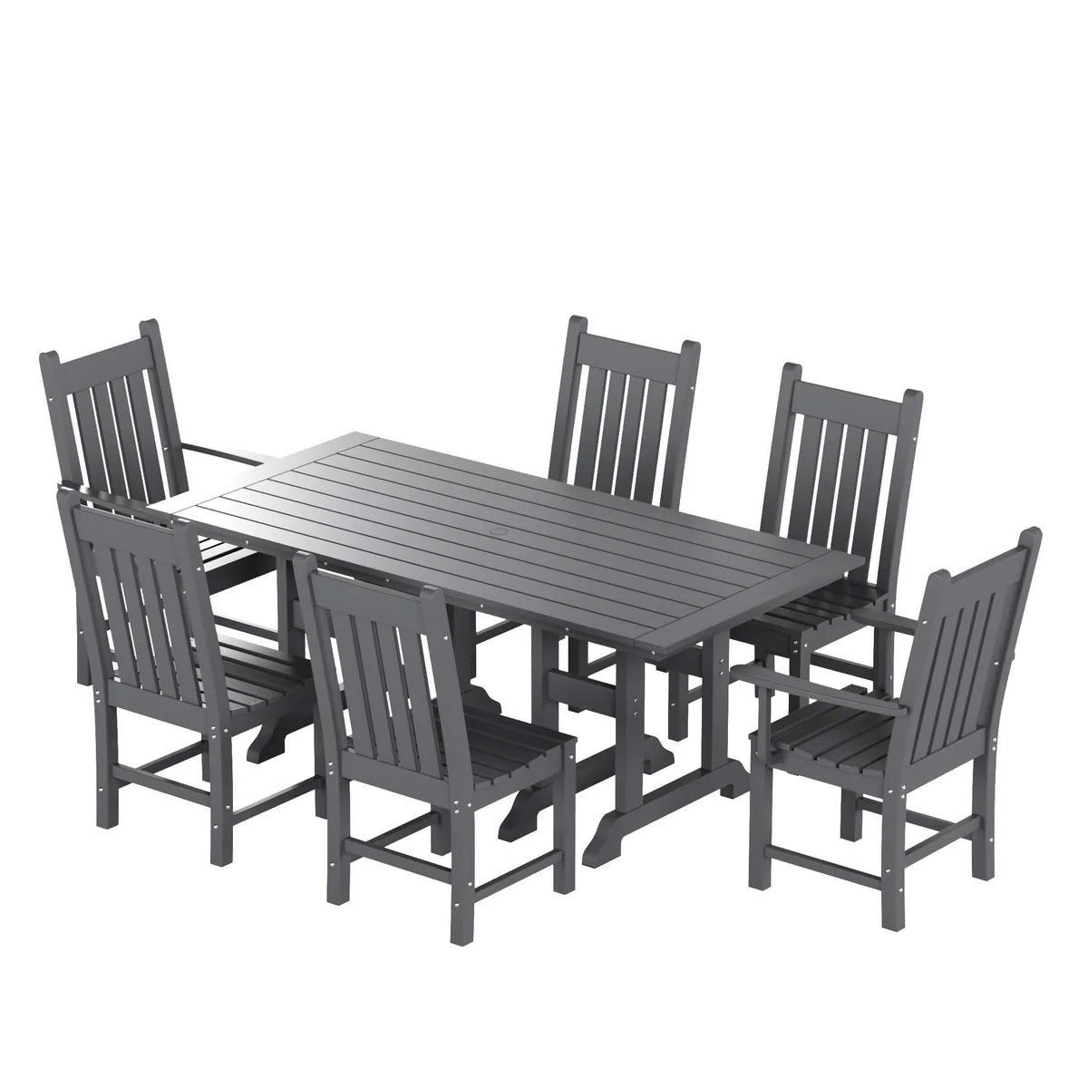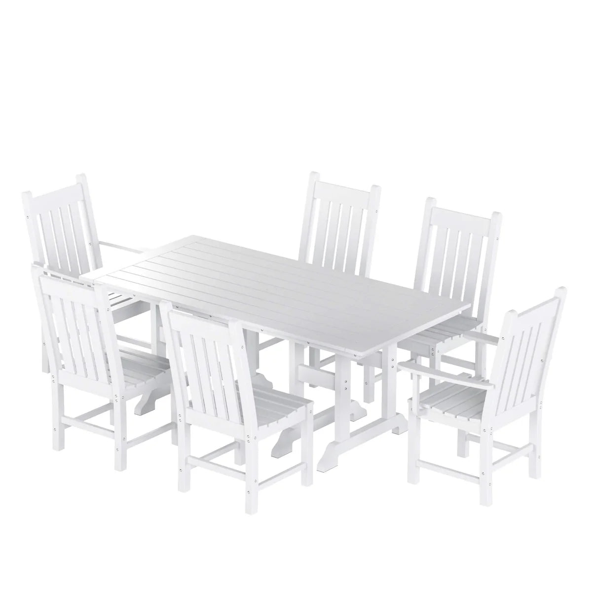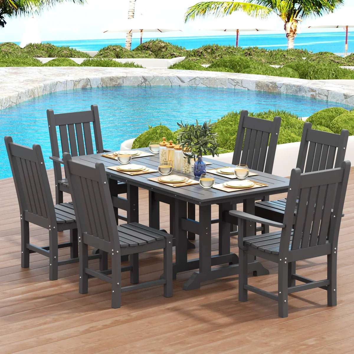 Gather family and friends around the table to enjoy outdoors with this 7-Piece dining set. This classic set can be seats up to six guests, place this spacious set on your patio or deck, you and your family or friends can sit around it on warm summer evenings and create an intimate outdoor dining atmosphere, enjoy making many memories together for years to come. Constructed of durable HDPE poly plastic and rust resistant hardware. Made with quality materials that will last the test of time. The eco friendly plastic outdoor table and chair sets will resist moisture, decay, and rainwater. Resistant to a variety of weather conditions and UV treated to help keep its rich color.