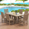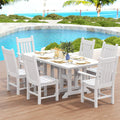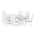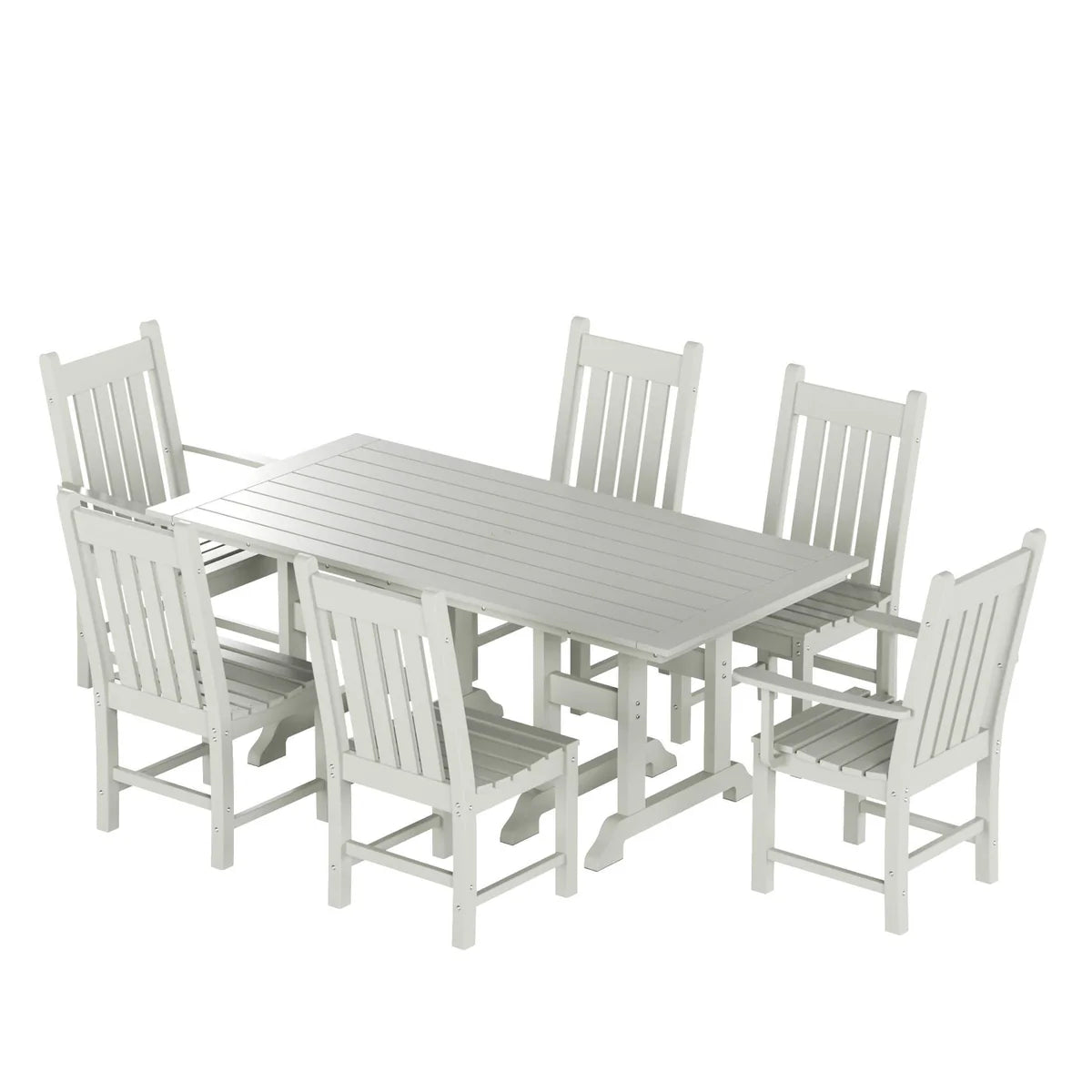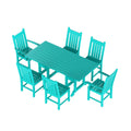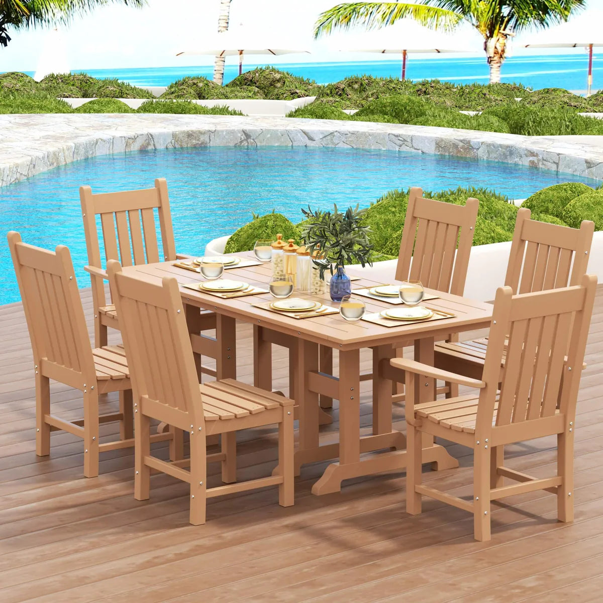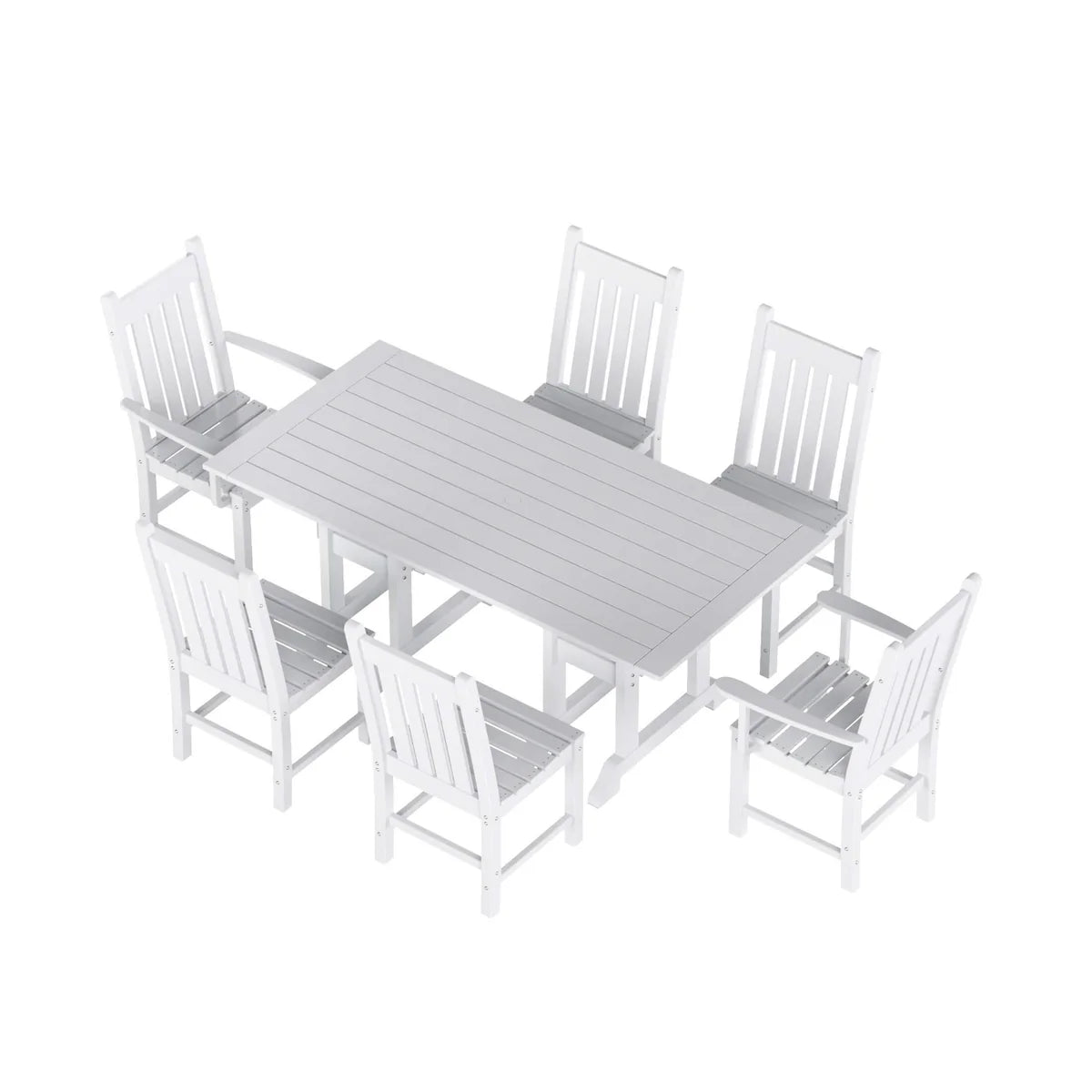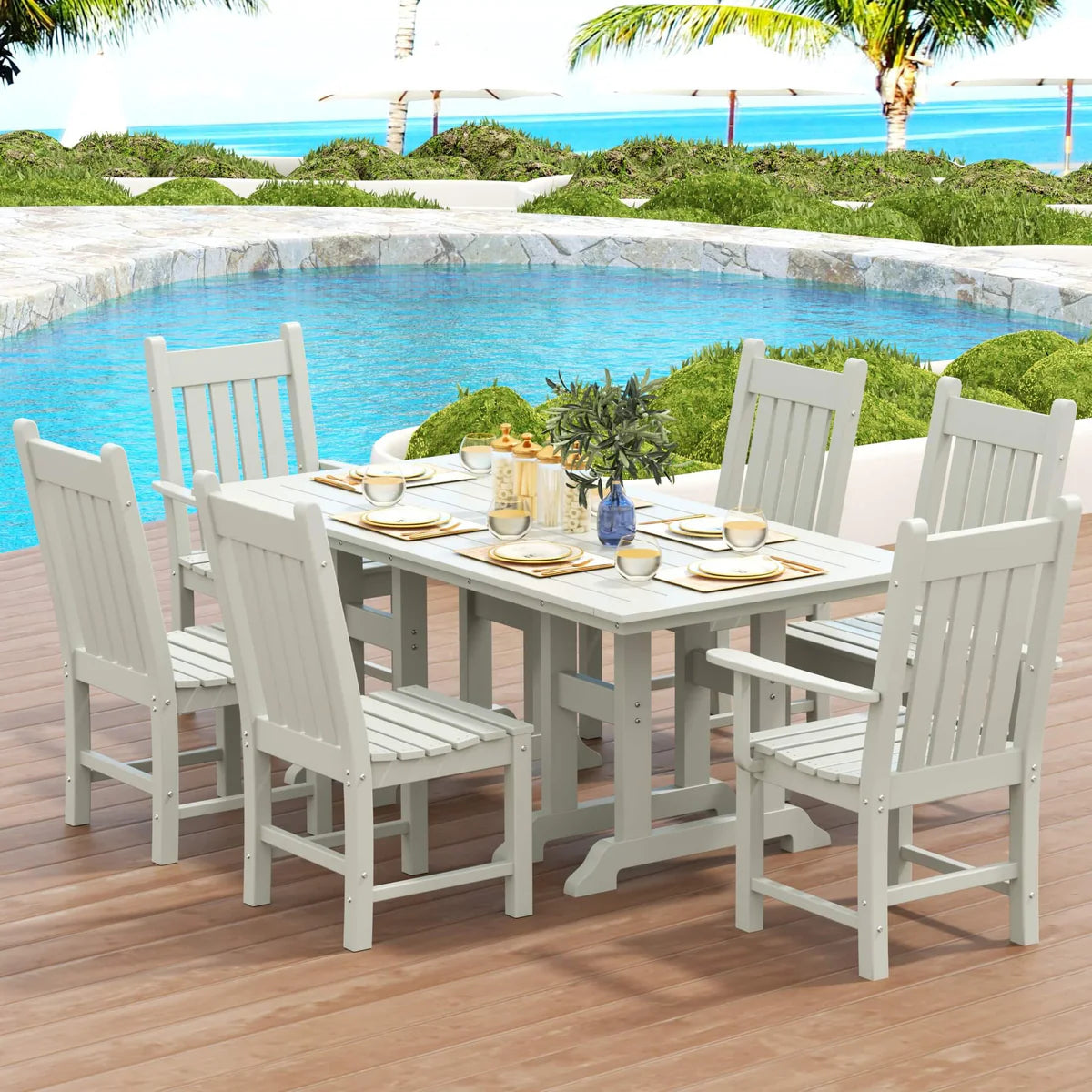 Gather family and friends around the table to enjoy outdoors with this 7-Piece dining set. This classic set can be seats up to six guests, place this spacious set on your patio or deck, you and your family or friends can sit around it on warm summer evenings and create an intimate outdoor dining atmosphere, enjoy making many memories together for years to come. Constructed of durable HDPE poly plastic and rust resistant hardware. Made with quality materials that will last the test of time. The eco friendly plastic outdoor table and chair sets will resist moisture, decay, and rainwater. Resistant to a variety of weather conditions and UV treated to help keep its rich color.