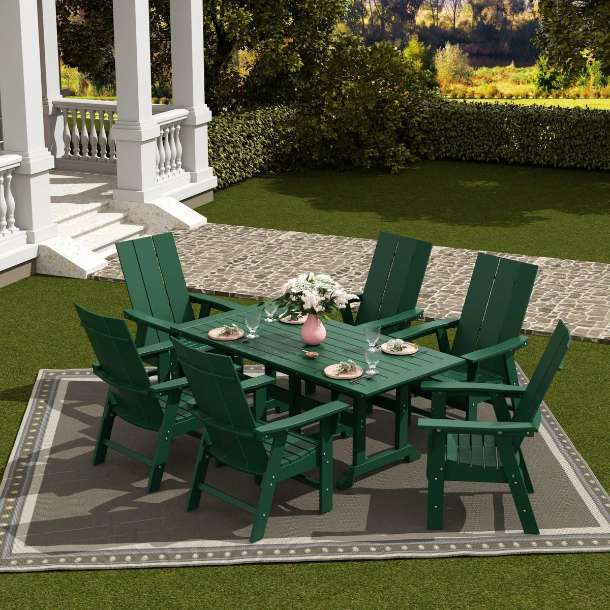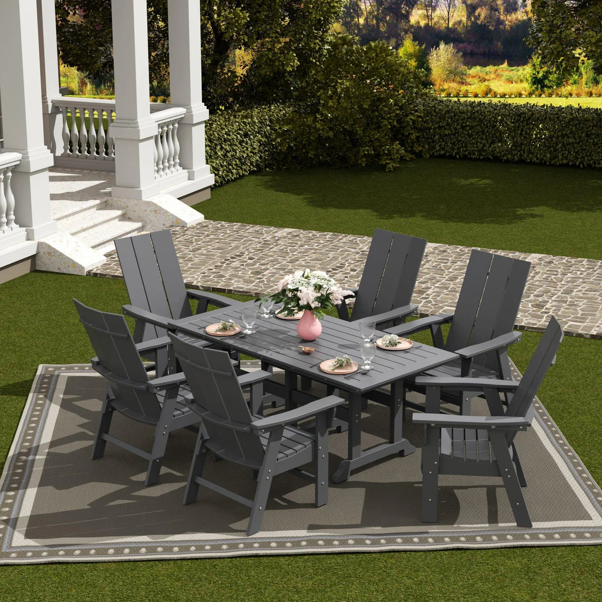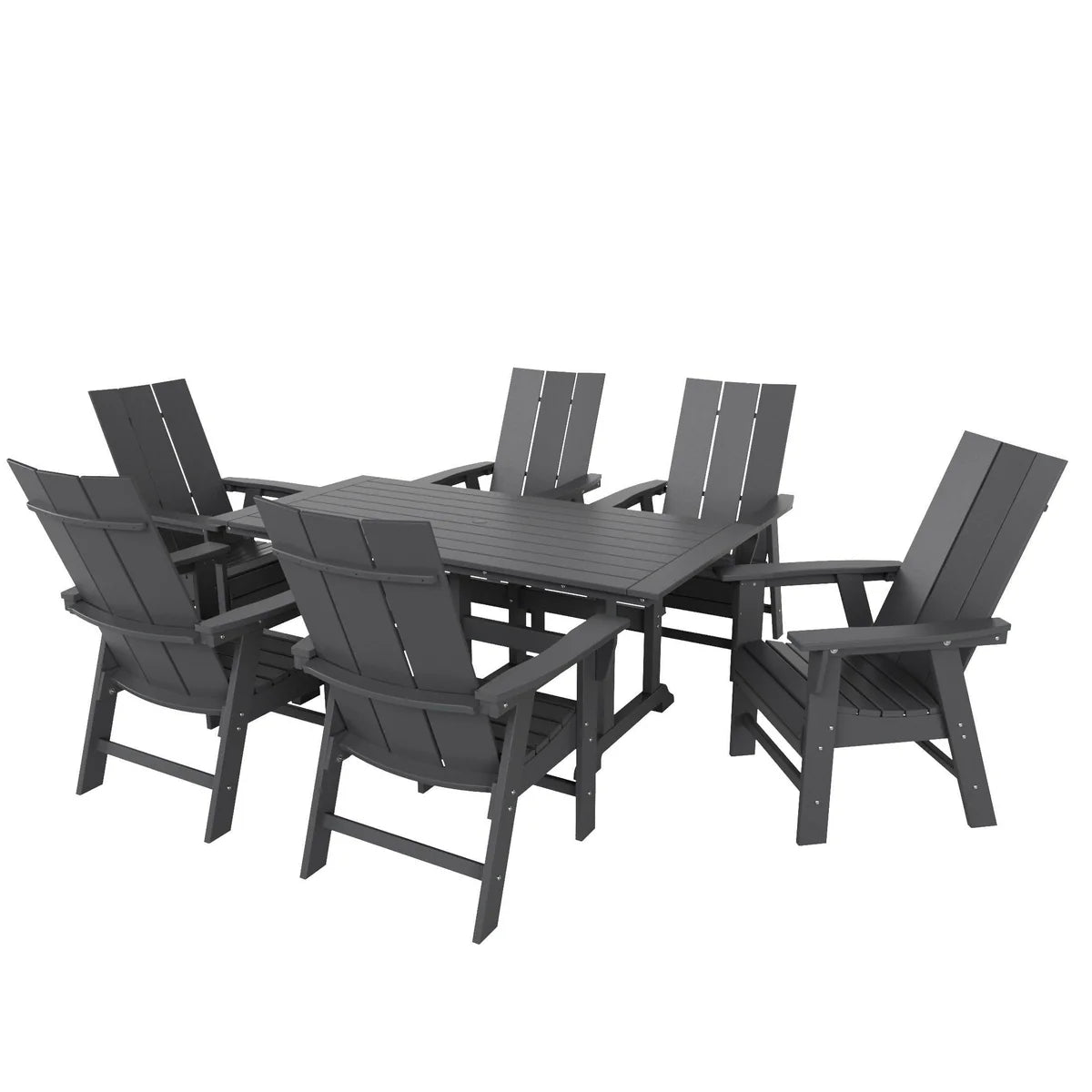 Heat up the grill and bring the family outside this season while relaxing on this beautiful 7-piece dining set. Designed for comfort, the modern Adirondack chairs feature a curved backrest, contoured seat, and a waterfall slope that create a comfortable chair. Constructed with a durable HDPE plastic that is designed to last season after season with the help of the rust-resistant hardware and UV and weather resistant HDPE. This set is sure to spruce up your patio and be a center piece of your backyard.
