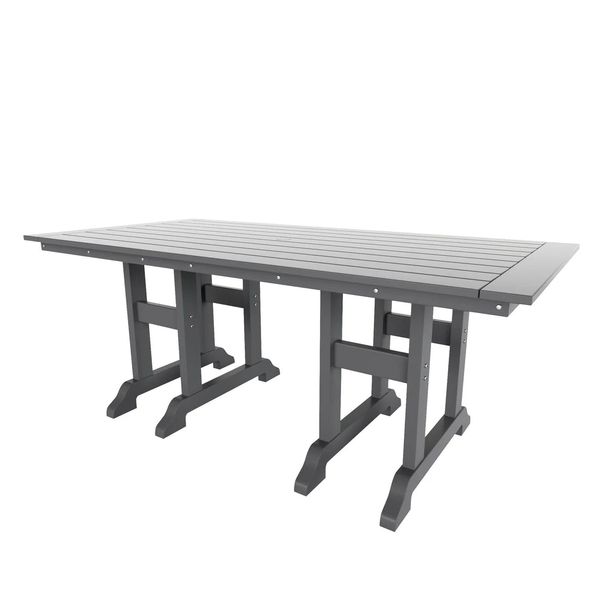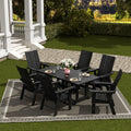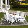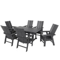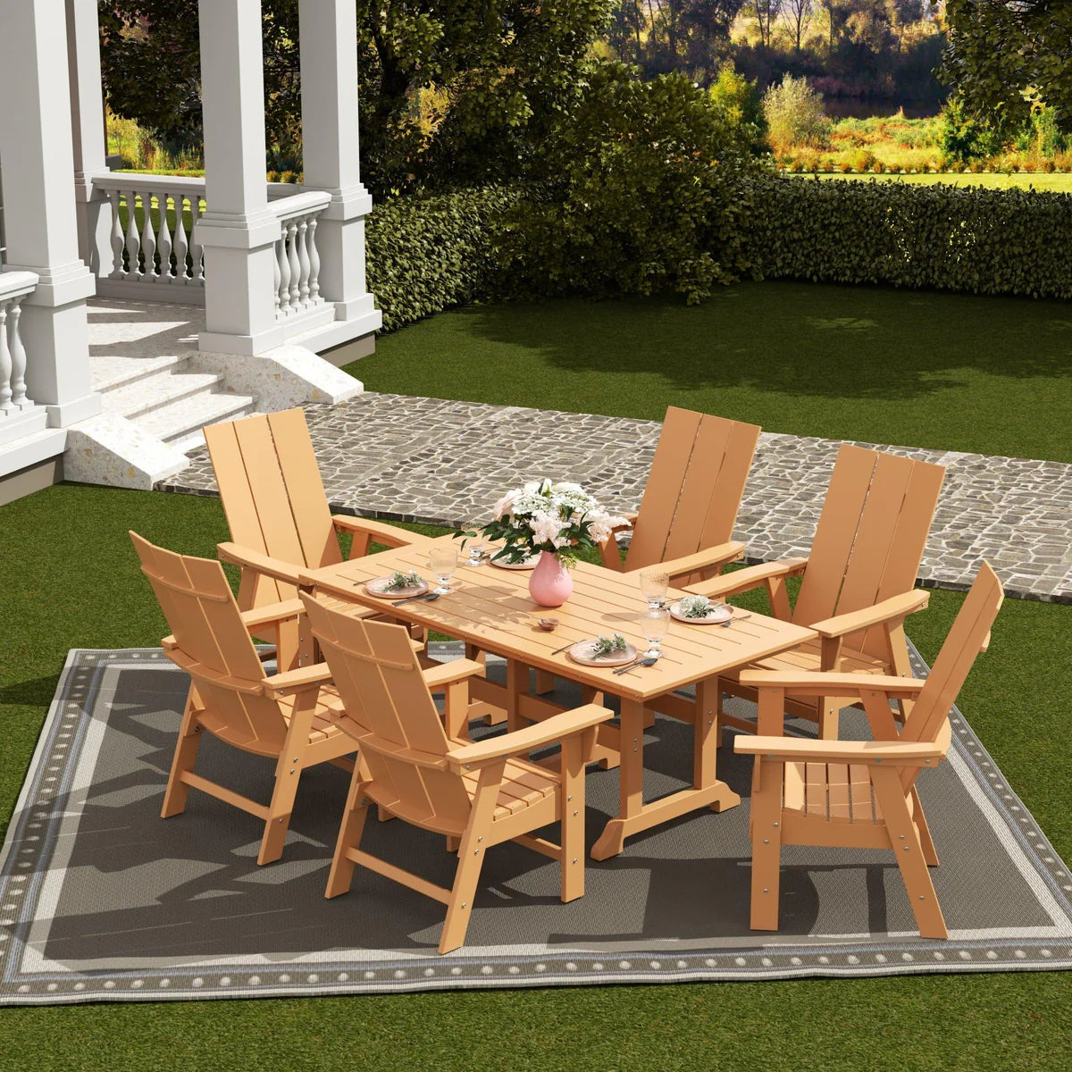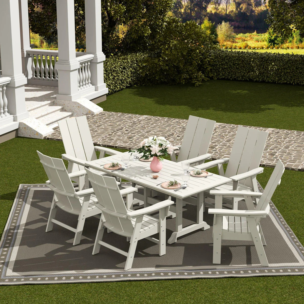 Heat up the grill and bring the family outside this season while relaxing on this beautiful 7-piece dining set. Designed for comfort, the modern Adirondack chairs feature a curved backrest, contoured seat, and a waterfall slope that create a comfortable chair. Constructed with a durable HDPE plastic that is designed to last season after season with the help of the rust-resistant hardware and UV and weather resistant HDPE. This set is sure to spruce up your patio and be a center piece of your backyard.