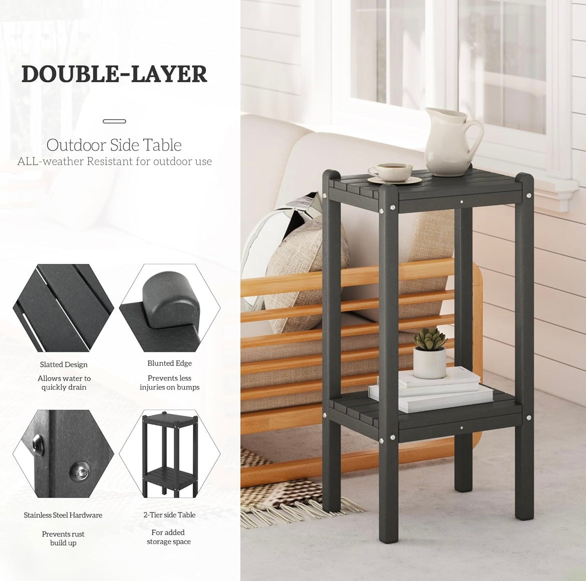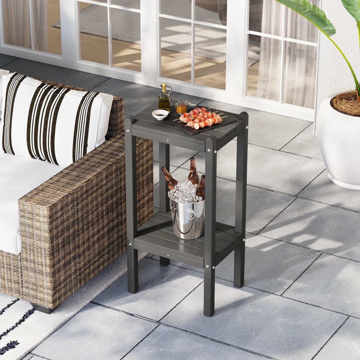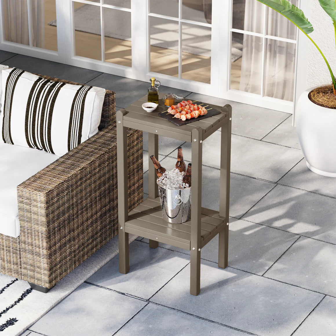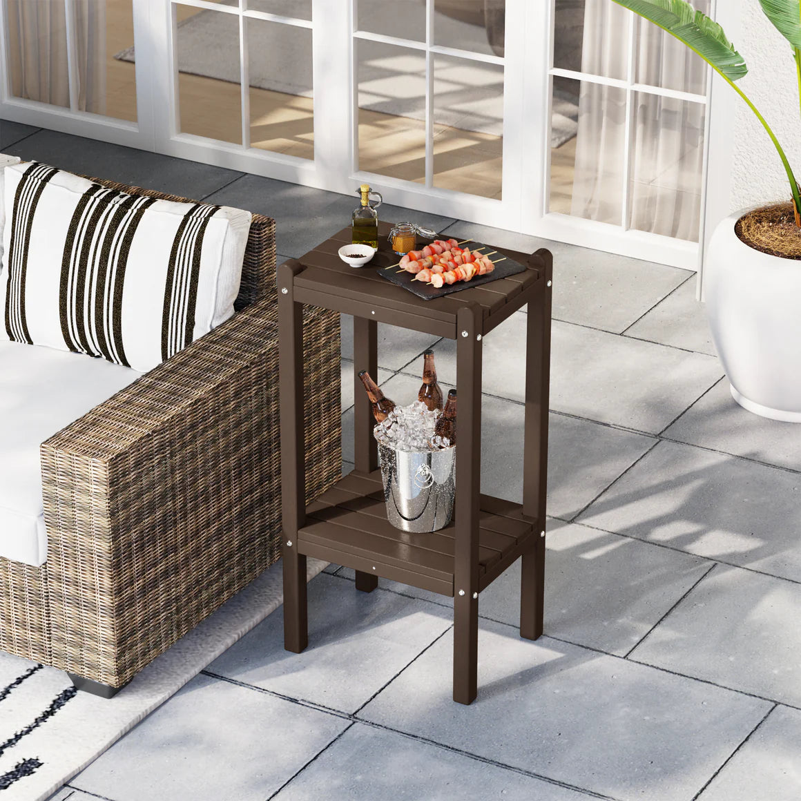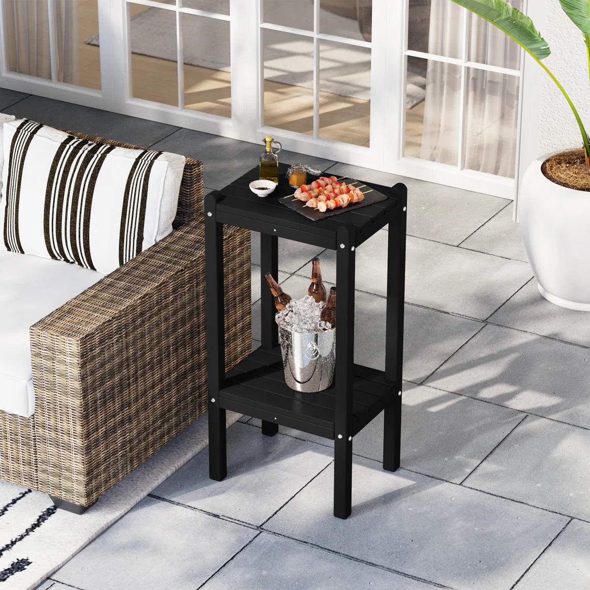 Perfect side table as an outdoor side table by the poolside or as a charming storage space and side table in the bathroom. The unique two-shelf design of the tabletop & shelf can provide you with ample storage space for daily use. What's more, is its compact size, you can place it in any position you like, such as sofa side, bathroom, or narrow corners. Such a simple and elegant end table will be the top choice for your home. Guests who are standing around your outdoor entertainment area will love the convenience of the two-shelf side table.
