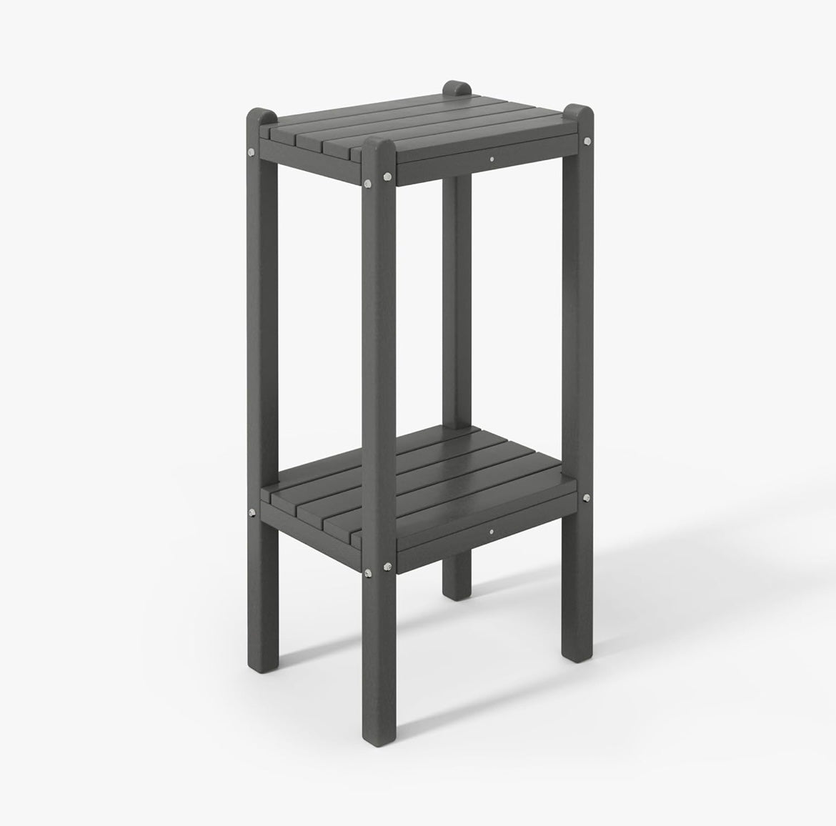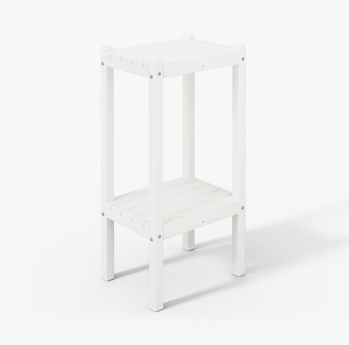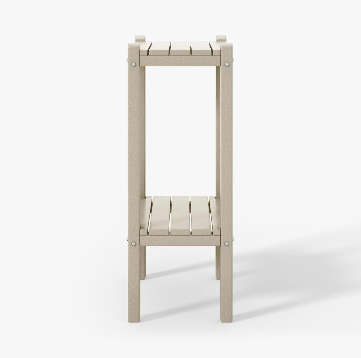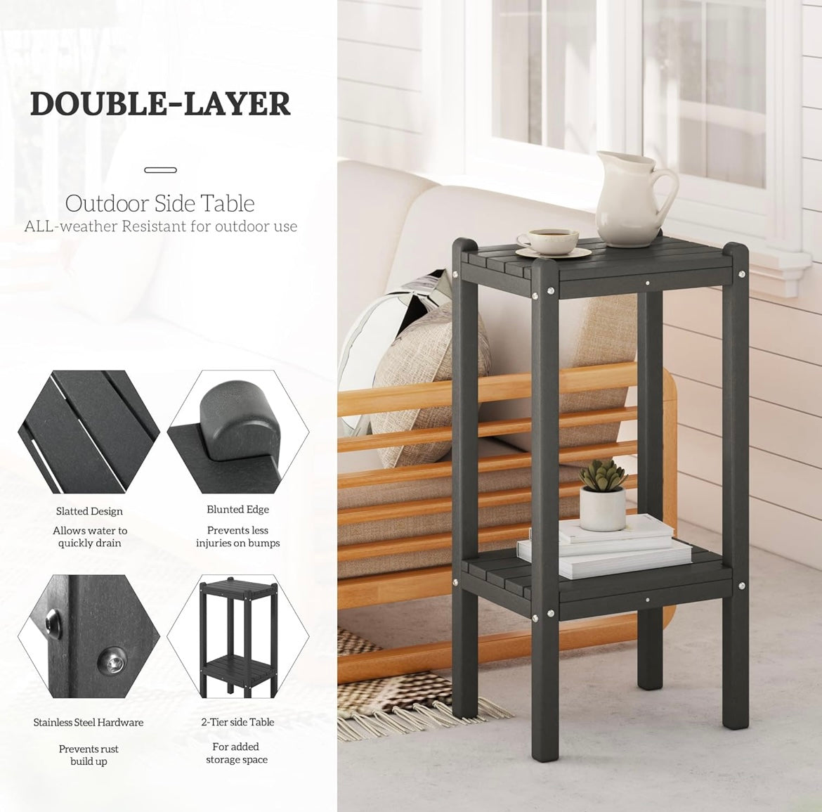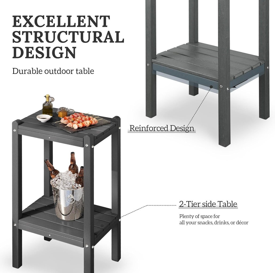 Perfect side table as an outdoor side table by the poolside or as a charming storage space and side table in the bathroom. The unique two-shelf design of the tabletop & shelf can provide you with ample storage space for daily use. What's more, is its compact size, you can place it in any position you like, such as sofa side, bathroom, or narrow corners. Such a simple and elegant end table will be the top choice for your home. Guests who are standing around your outdoor entertainment area will love the convenience of the two-shelf side table.
