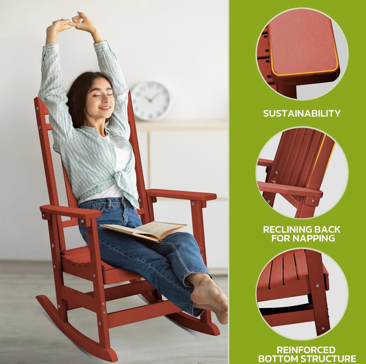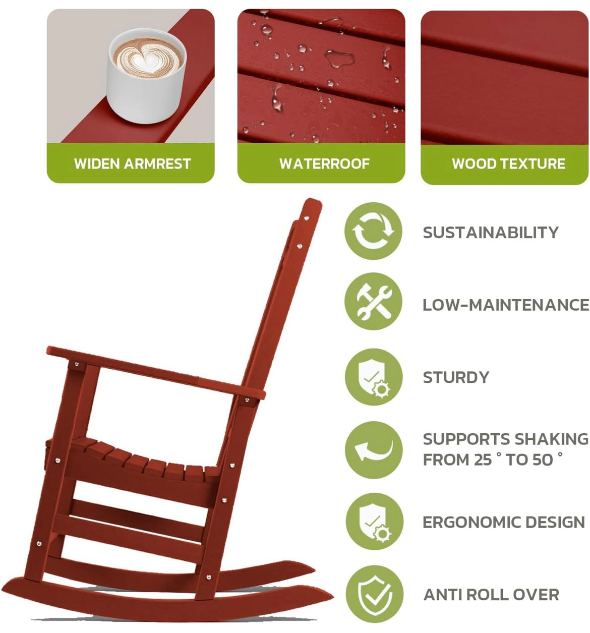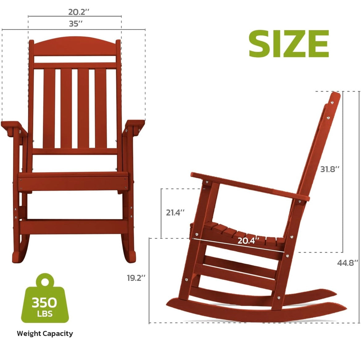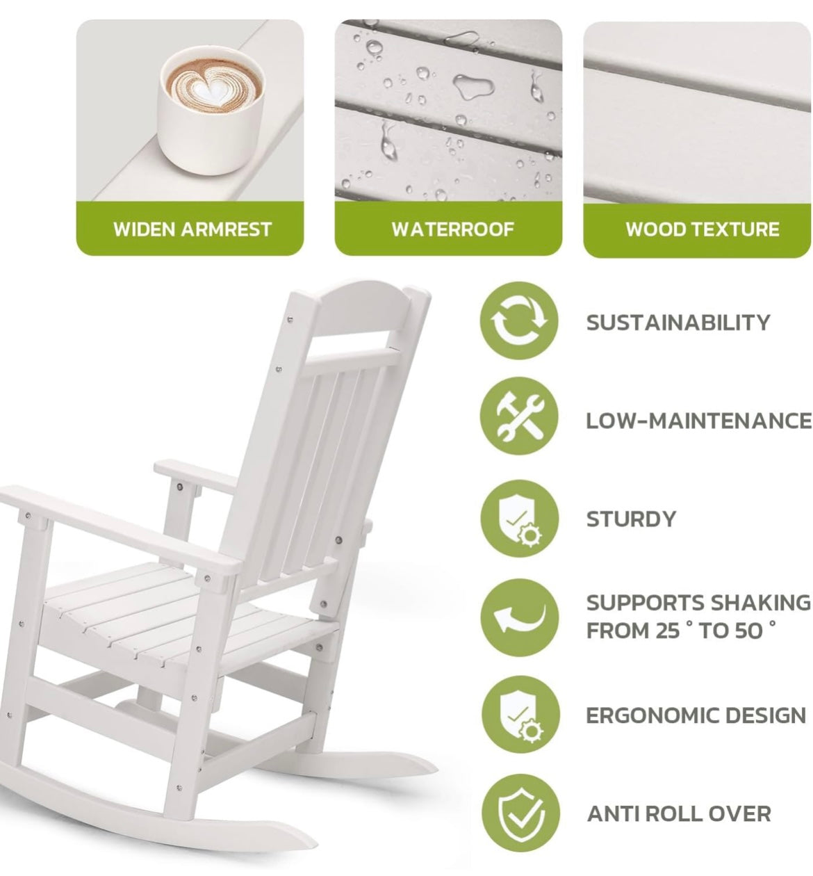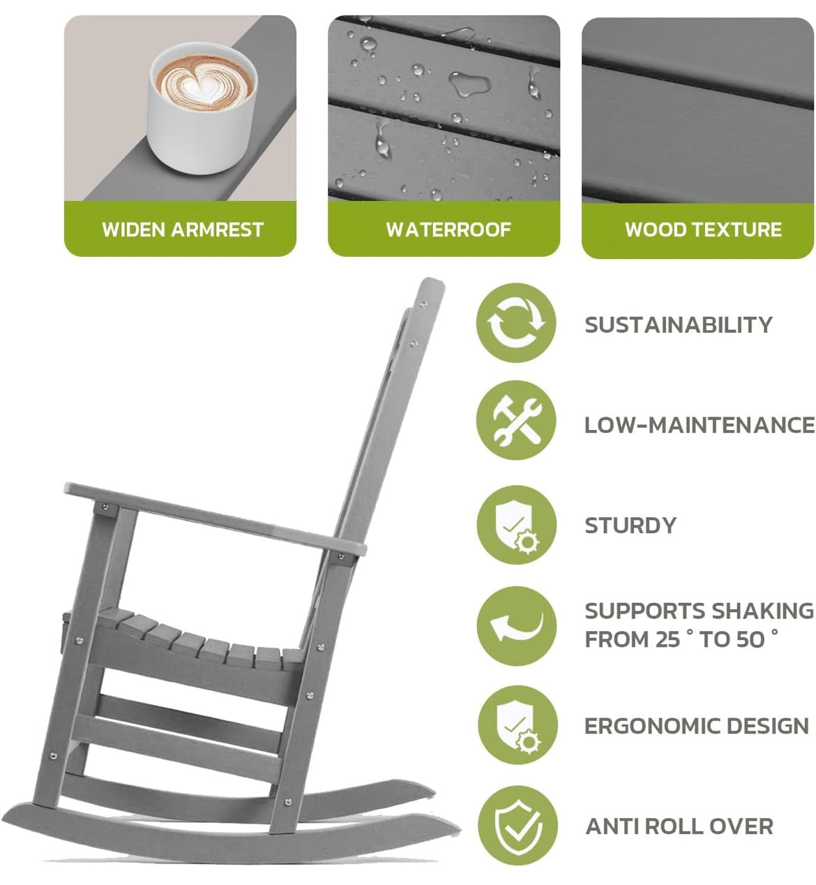 These outdoor rockers are the perfect lounging chair for the porch, patio, poolside or even the mountains. Made of high-density polyethylene, the water-resistant rocker withstands hot sun, heavy snow, torrential rain, strong coastal winds, etc. More friendly than wood: Polyethylene with woodgrain allows you to enjoy wood-like comfort but does not scratch skin like worn wood. Relax you completely: Our ergonomic porch rocking chair can rock you to nap, relieving whole-day fatigue after working. The curved high back fits your body well and widened armrest allows your arms to comfortably stretch