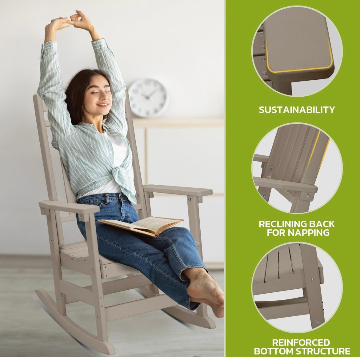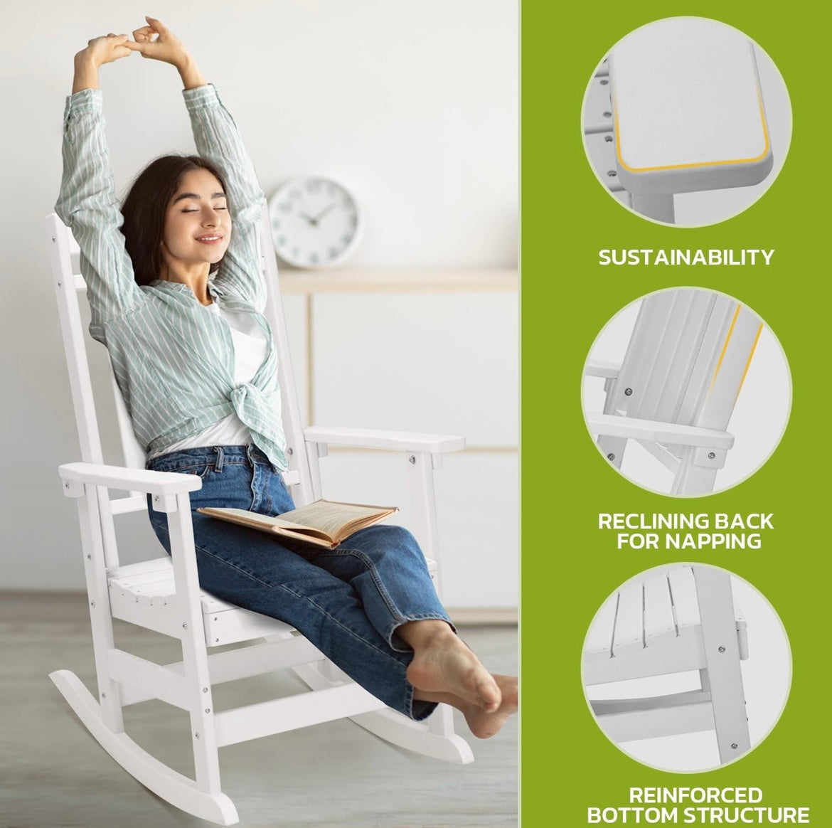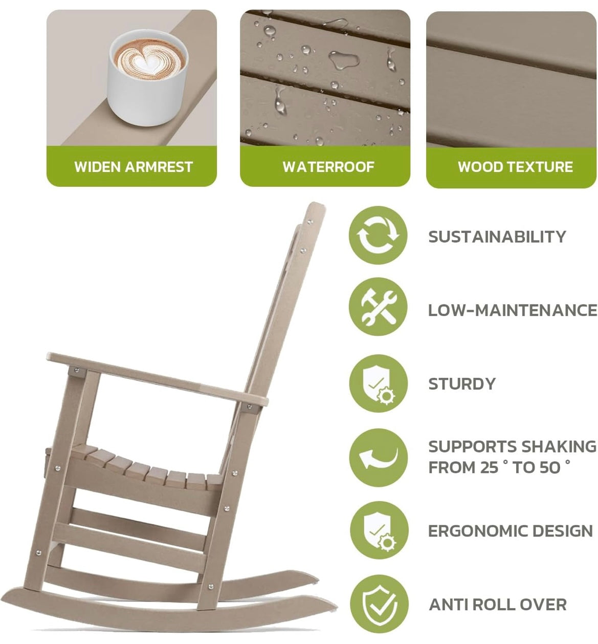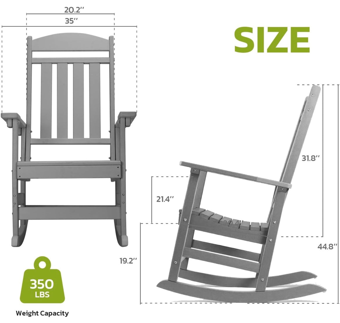These outdoor rockers are the perfect lounging chair for the porch, patio, poolside or even the mountains. Made of high-density polyethylene, the water-resistant rocker withstands hot sun, heavy snow, torrential rain, strong coastal winds, etc. More friendly than wood: Polyethylene with woodgrain allows you to enjoy wood-like comfort but does not scratch skin like worn wood. Relax you completely: Our ergonomic porch rocking chair can rock you to nap, relieving whole-day fatigue after working. The curved high back fits your body well and widened armrest allows your arms to comfortably stretch