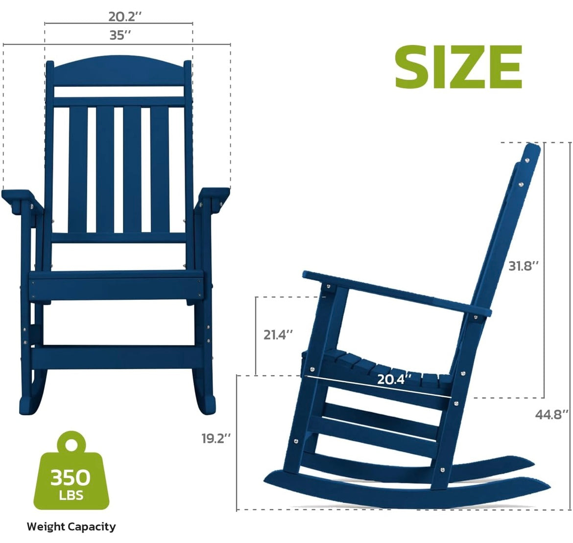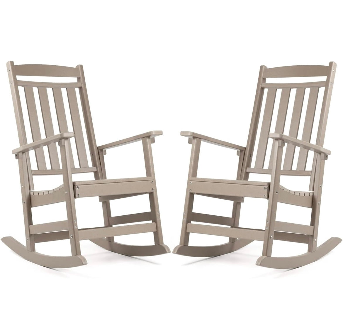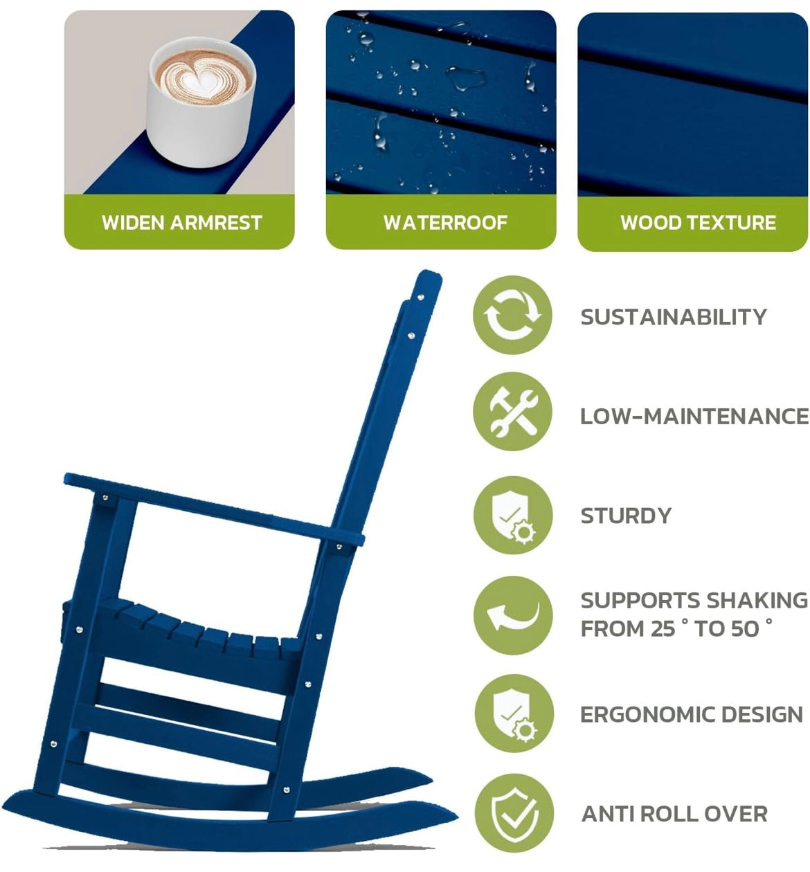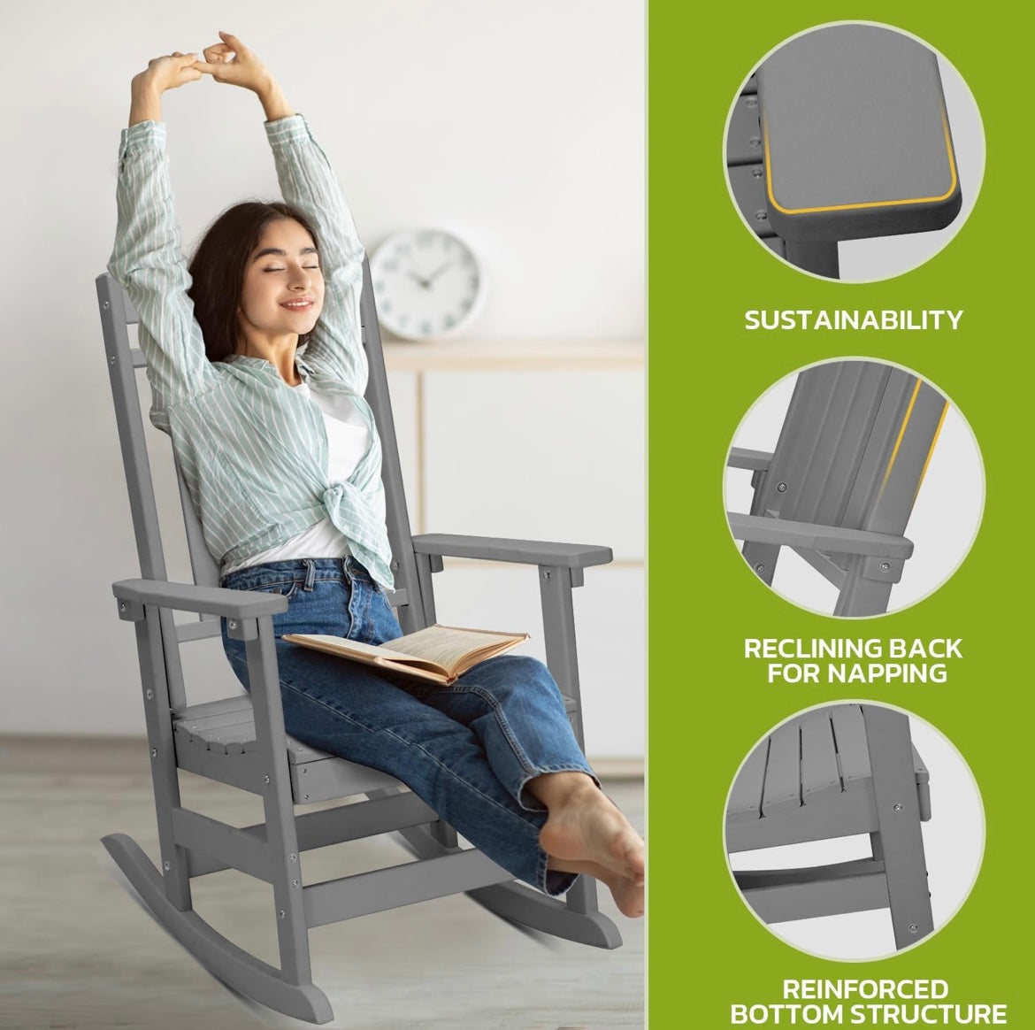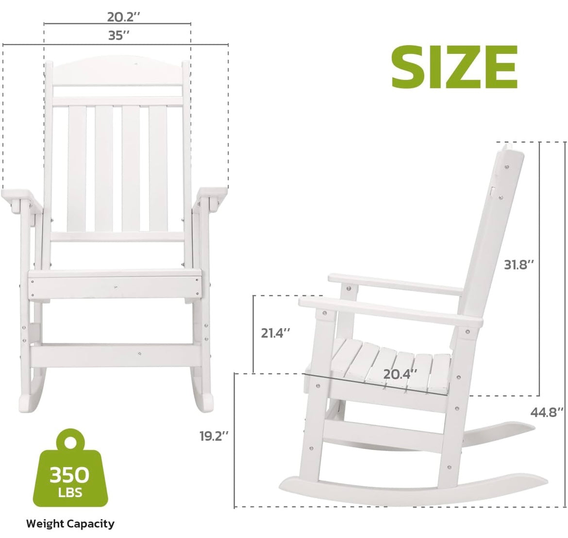 These outdoor rockers are the perfect lounging chair for the porch, patio, poolside or even the mountains. Made of high-density polyethylene, the water-resistant rocker withstands hot sun, heavy snow, torrential rain, strong coastal winds, etc. More friendly than wood: Polyethylene with woodgrain allows you to enjoy wood-like comfort but does not scratch skin like worn wood. Relax you completely: Our ergonomic porch rocking chair can rock you to nap, relieving whole-day fatigue after working. The curved high back fits your body well and widened armrest allows your arms to comfortably stretch