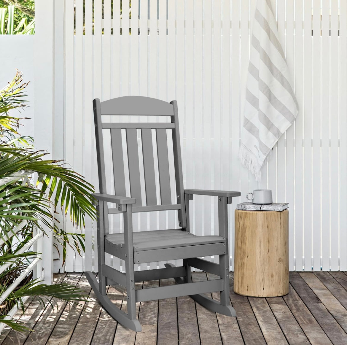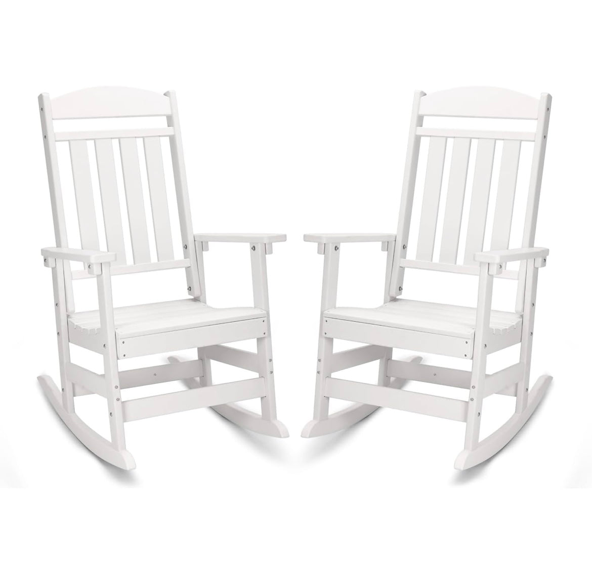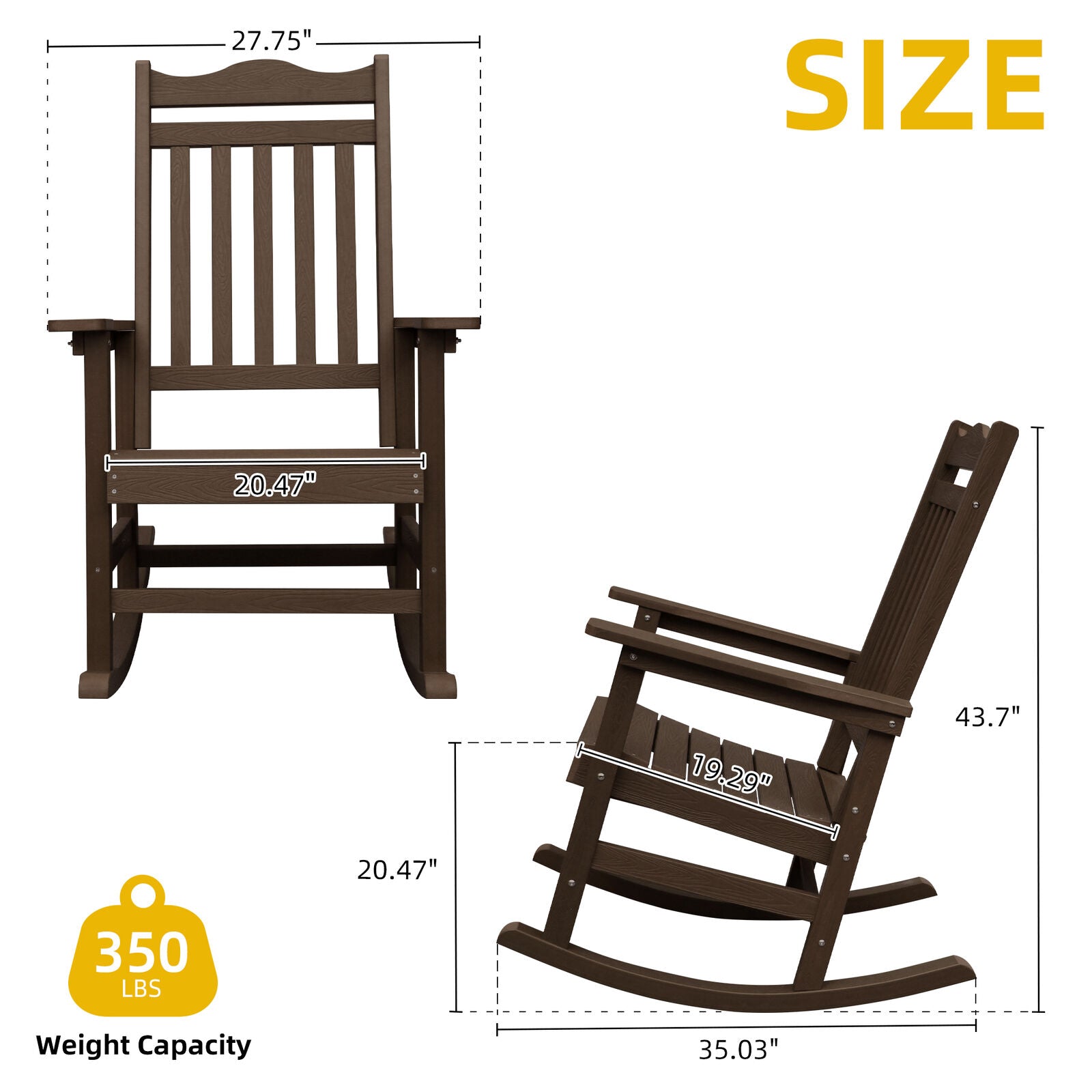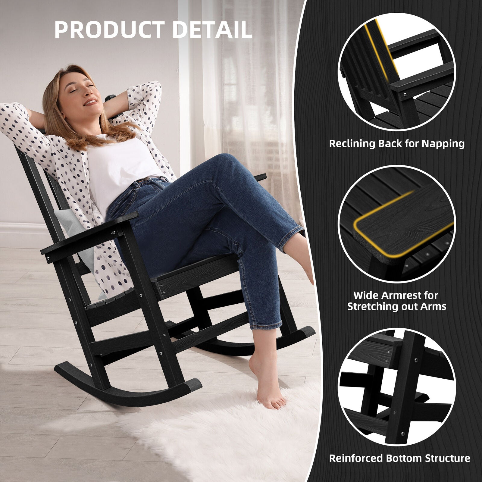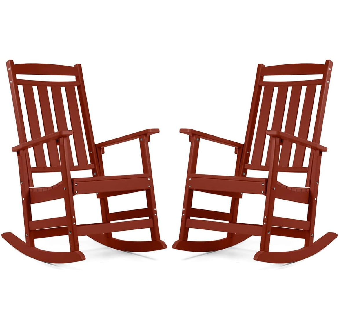 These outdoor rockers are the perfect lounging chair for the porch, patio, poolside or even the mountains. Made of high-density polyethylene, the water-resistant rocker withstands hot sun, heavy snow, torrential rain, strong coastal winds, etc. More friendly than wood: Polyethylene with woodgrain allows you to enjoy wood-like comfort but does not scratch skin like worn wood. Relax you completely: Our ergonomic porch rocking chair can rock you to nap, relieving whole-day fatigue after working. The curved high back fits your body well and widened armrest allows your arms to comfortably stretch