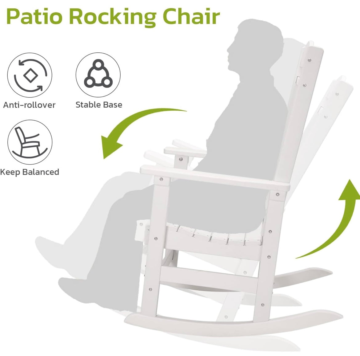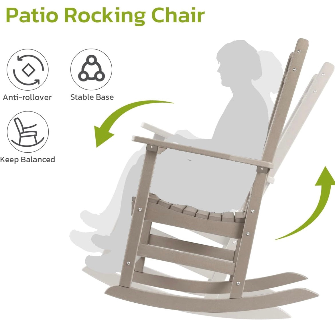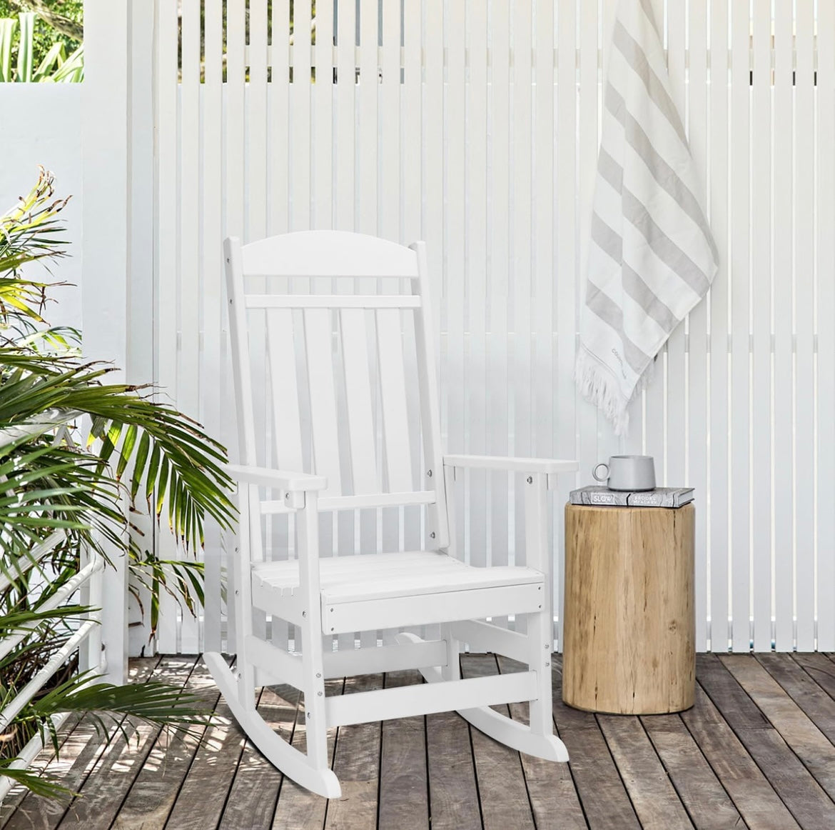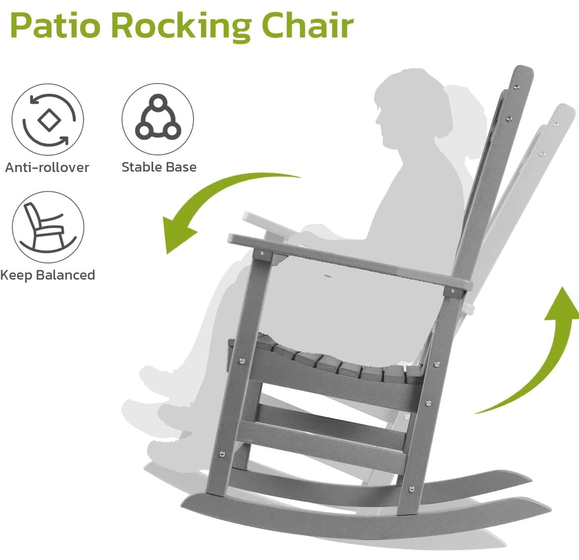 These outdoor rockers are the perfect lounging chair for the porch, patio, poolside or even the mountains. Made of high-density polyethylene, the water-resistant rocker withstands hot sun, heavy snow, torrential rain, strong coastal winds, etc. More friendly than wood: Polyethylene with woodgrain allows you to enjoy wood-like comfort but does not scratch skin like worn wood. Relax you completely: Our ergonomic porch rocking chair can rock you to nap, relieving whole-day fatigue after working. The curved high back fits your body well and widened armrest allows your arms to comfortably stretch
