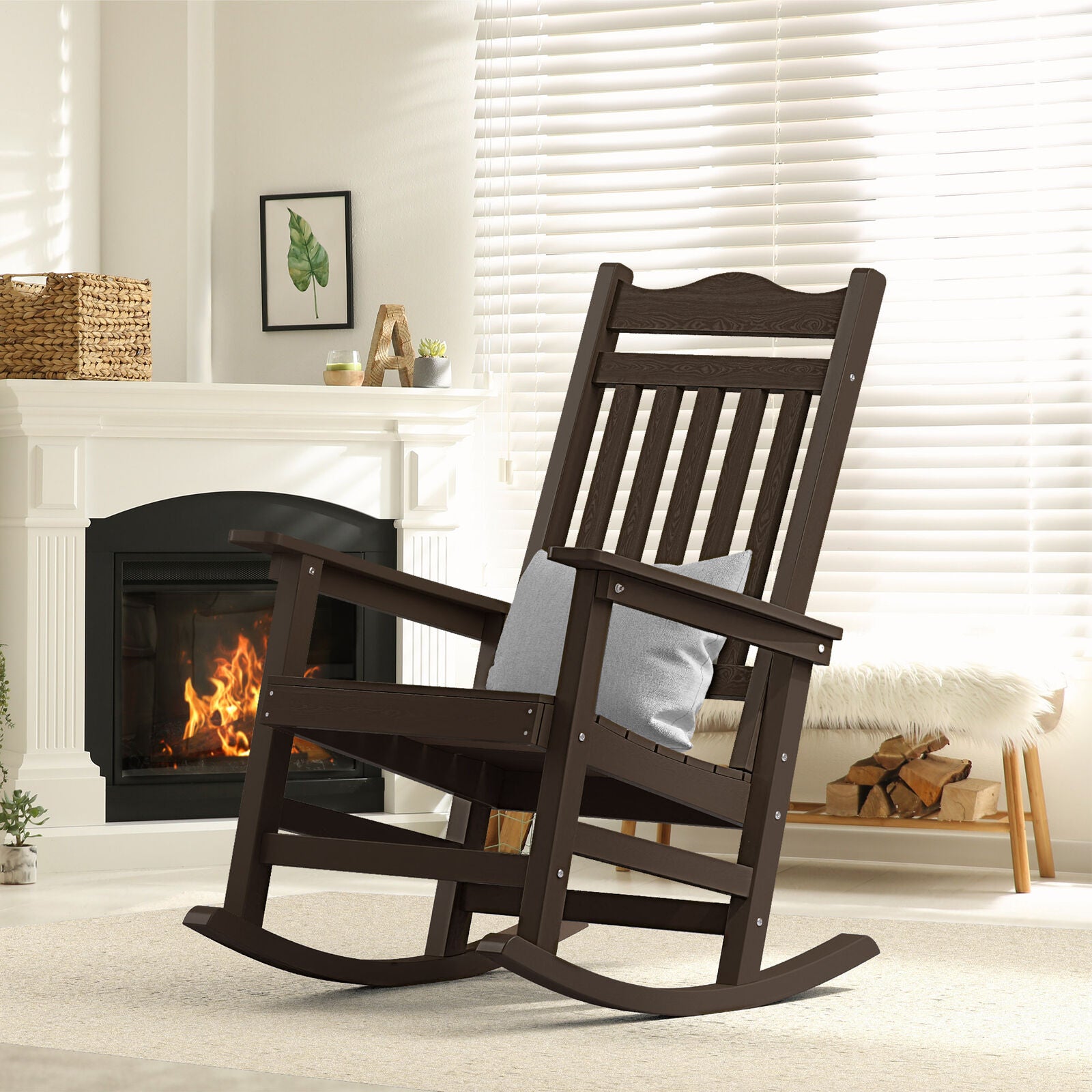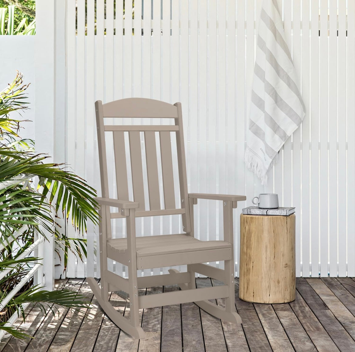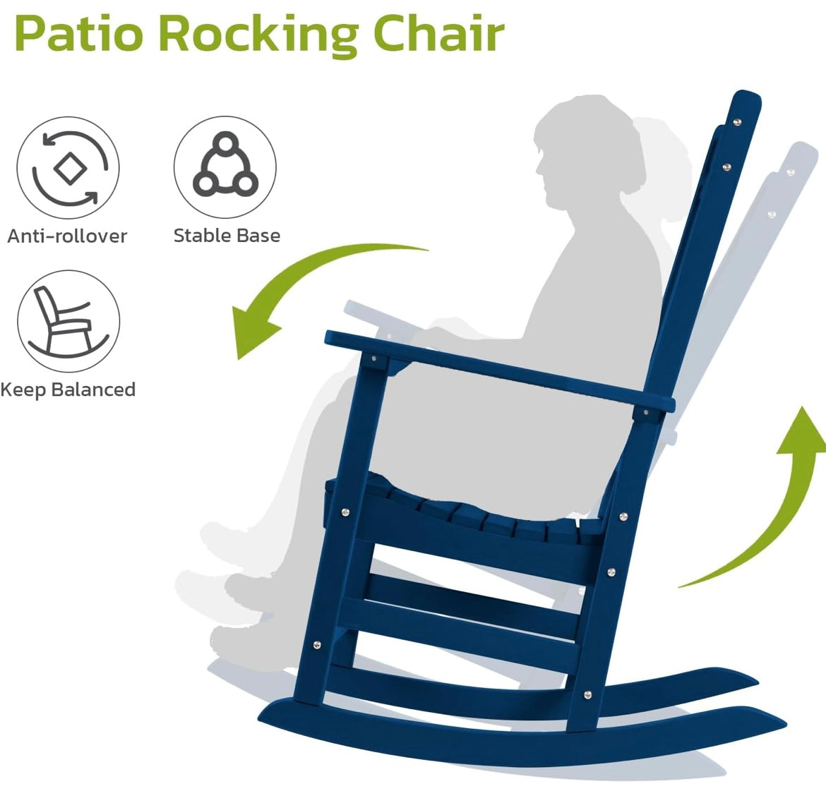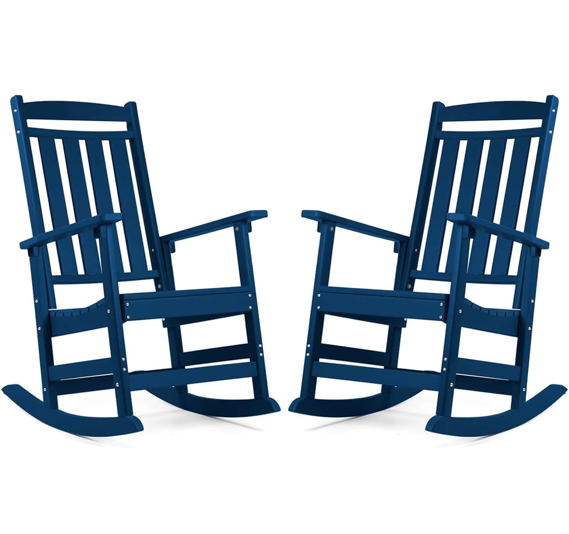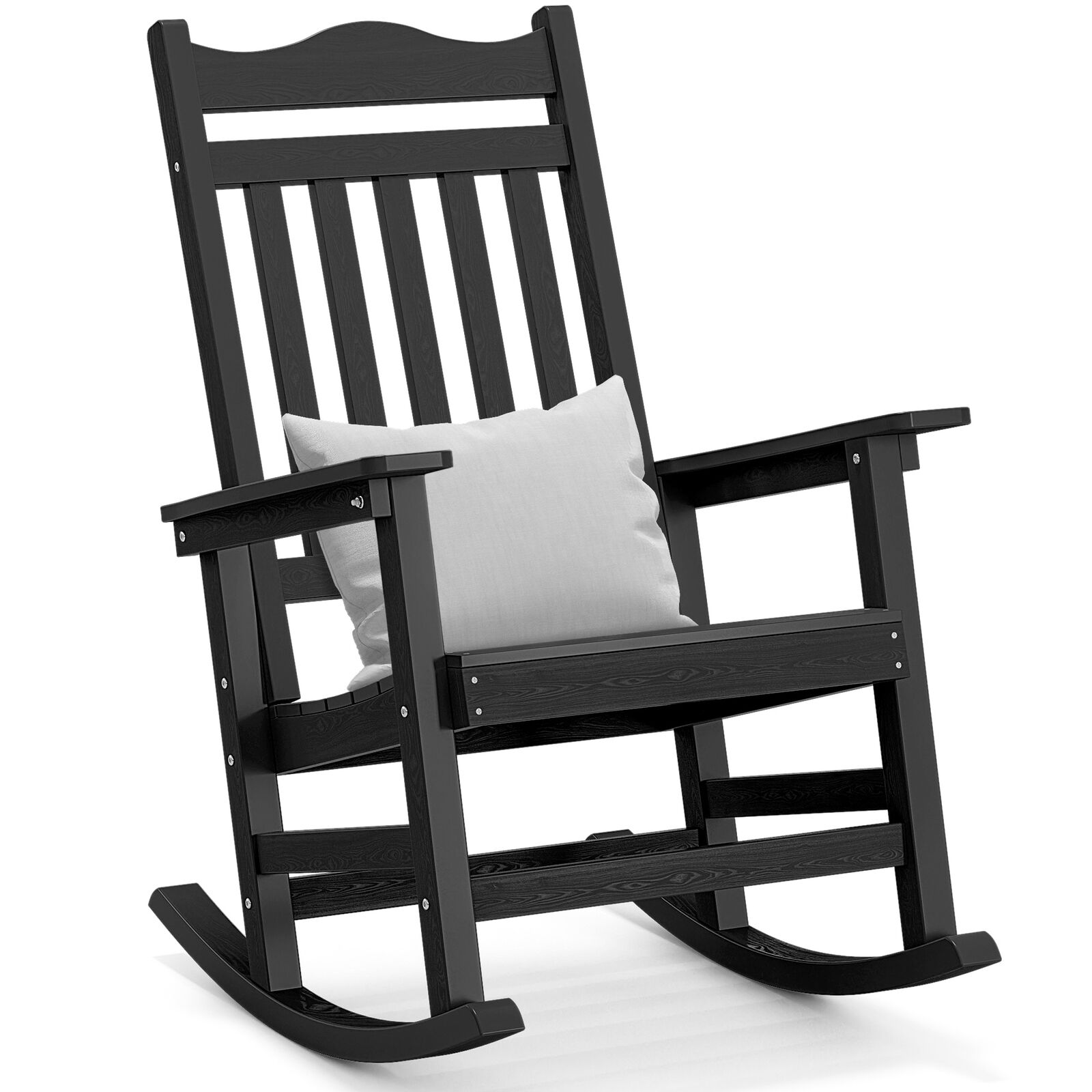 These outdoor rockers are the perfect lounging chair for the porch, patio, poolside or even the mountains. Made of high-density polyethylene, the water-resistant rocker withstands hot sun, heavy snow, torrential rain, strong coastal winds, etc. More friendly than wood: Polyethylene with woodgrain allows you to enjoy wood-like comfort but does not scratch skin like worn wood. Relax you completely: Our ergonomic porch rocking chair can rock you to nap, relieving whole-day fatigue after working. The curved high back fits your body well and widened armrest allows your arms to comfortably stretch