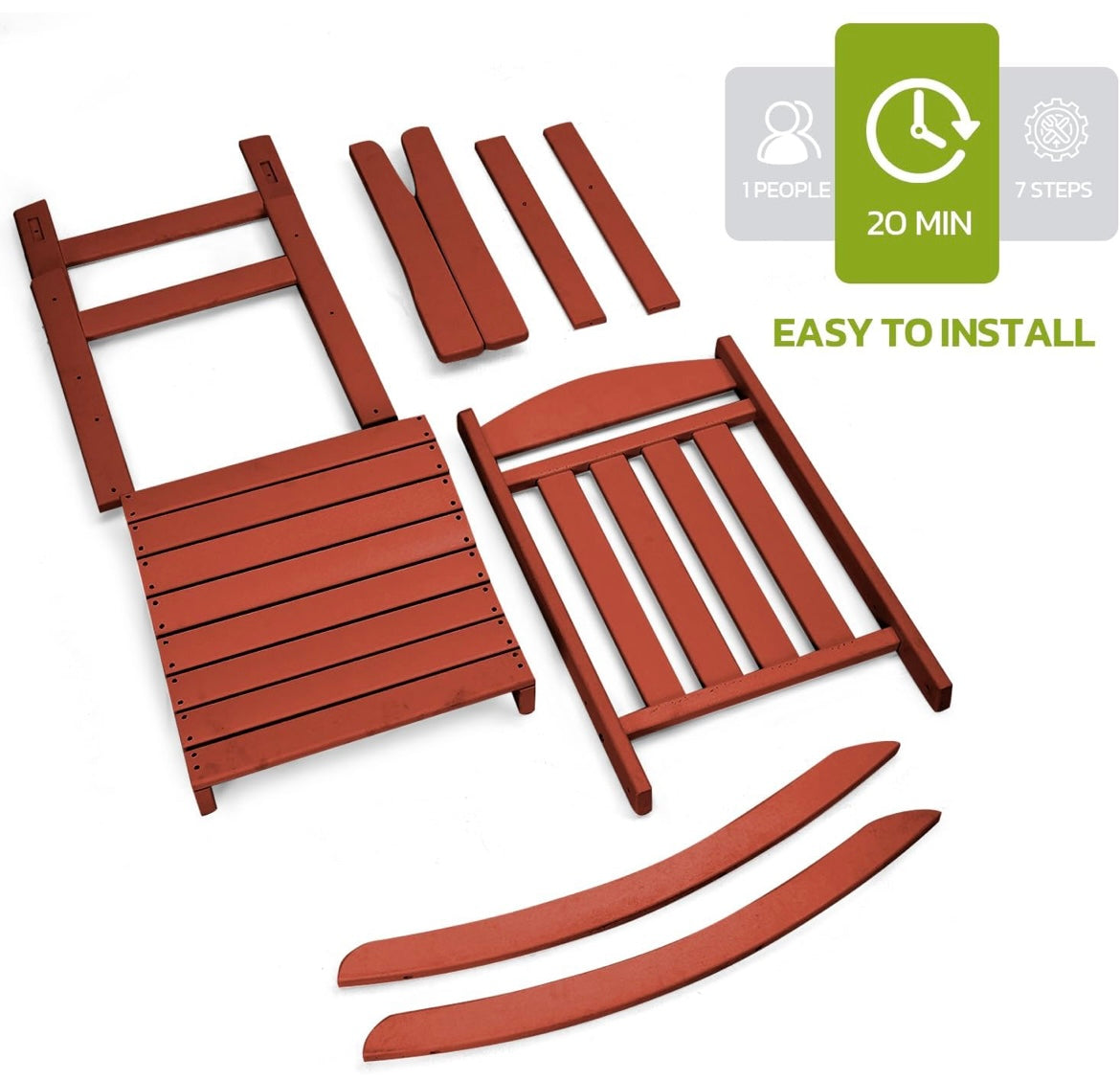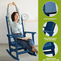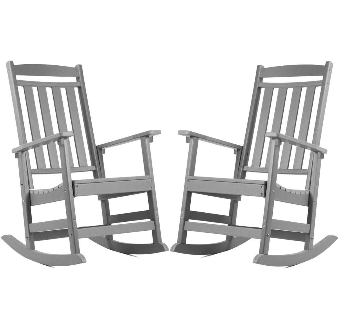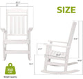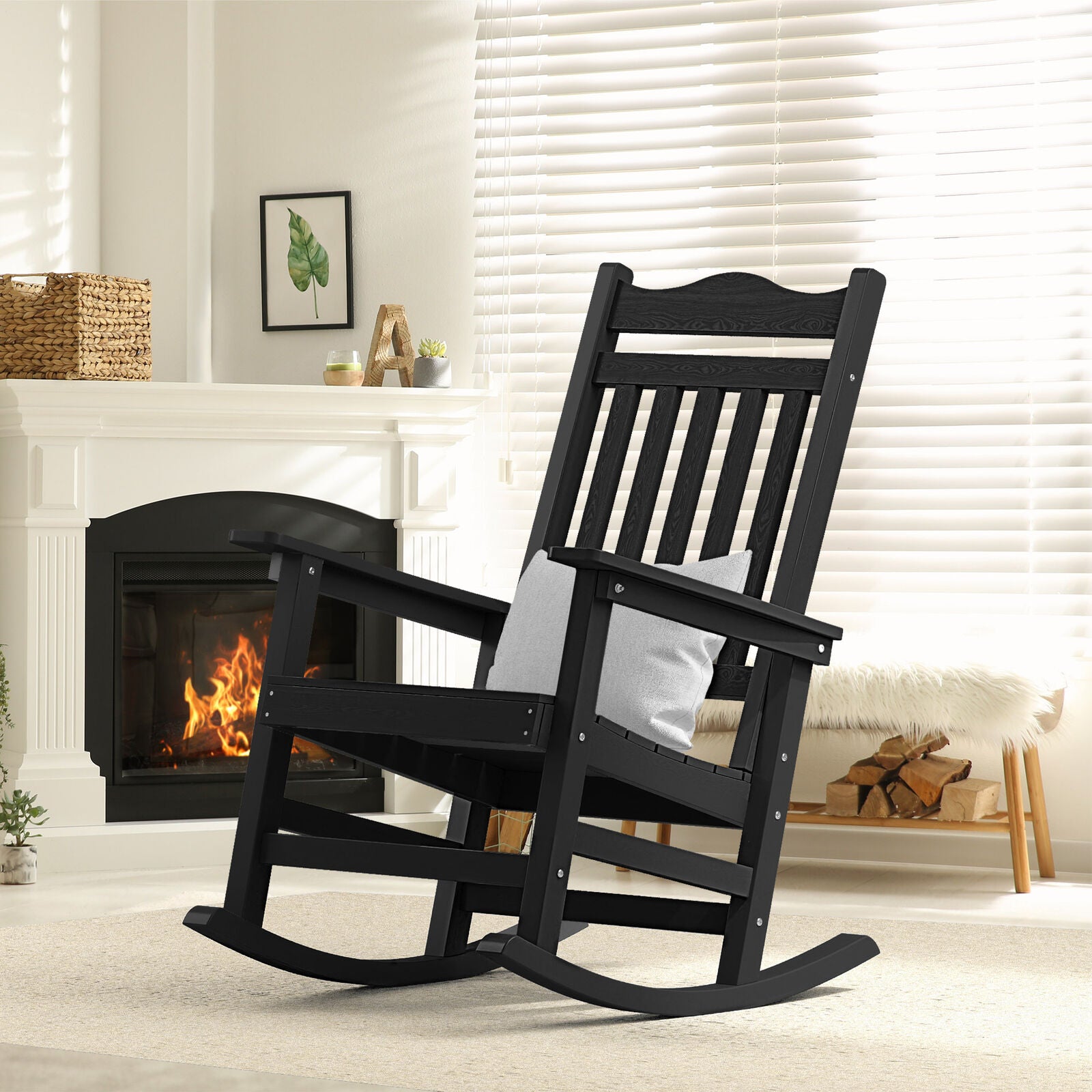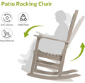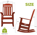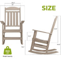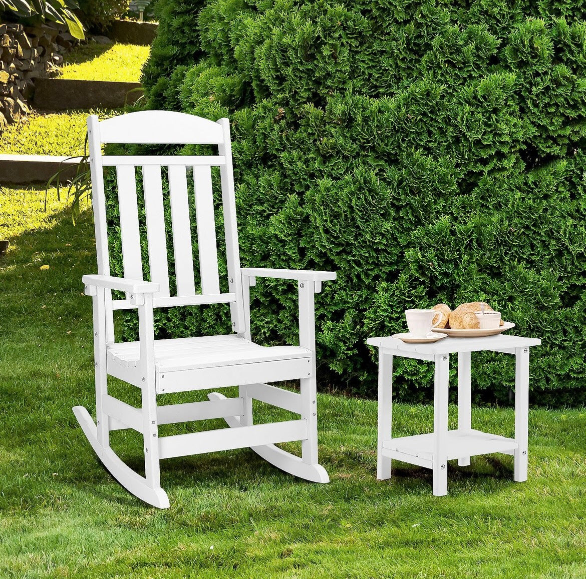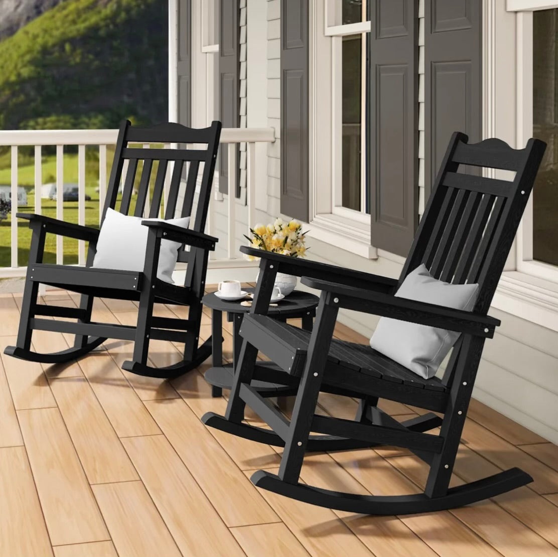 These outdoor rockers are the perfect lounging chair for the porch, patio, poolside or even the mountains. Made of high-density polyethylene, the water-resistant rocker withstands hot sun, heavy snow, torrential rain, strong coastal winds, etc. More friendly than wood: Polyethylene with woodgrain allows you to enjoy wood-like comfort but does not scratch skin like worn wood. Relax you completely: Our ergonomic porch rocking chair can rock you to nap, relieving whole-day fatigue after working. The curved high back fits your body well and widened armrest allows your arms to comfortably stretch